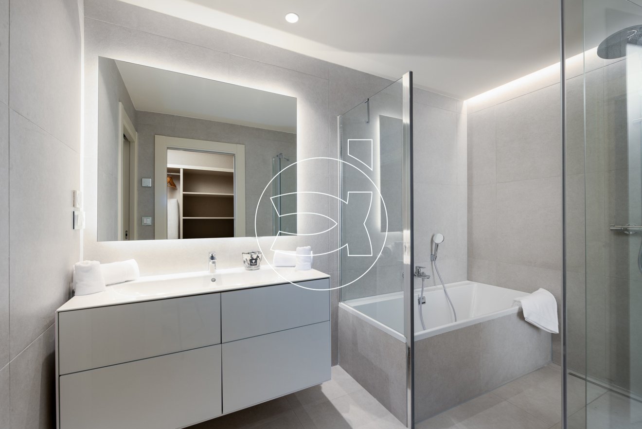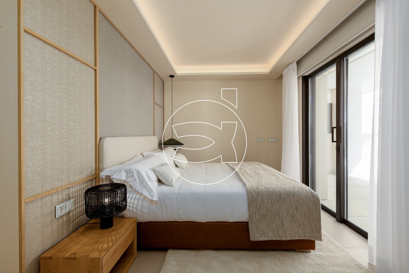 Mit drei Schlafzimmern bietet die Hauptsuite direkten Zugang zu einer privaten Terrasse, sowie ein eigenes Bad mit separater Badewanne und begehbarer Dusche, sowie einem kleinen Ankleidebereich.