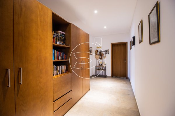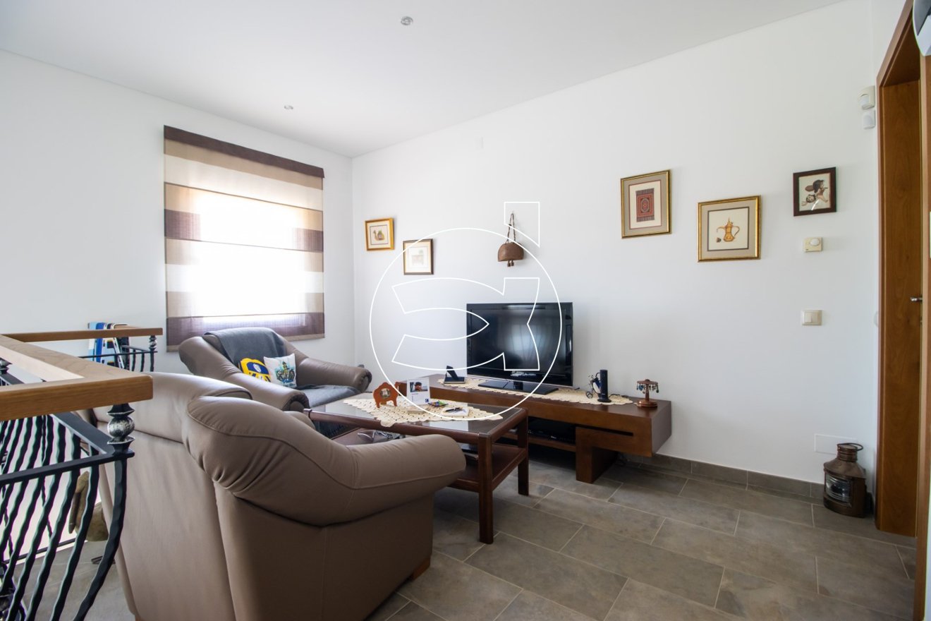 Eine beeindruckende Treppe führt in den ersten Stock, der derzeit als zusätzliche Sitzecke genutzt wird, ideal zum Fernsehen. Auf dieser Ebene befinden sich zwei weitere Doppelschlafzimmer mit eigenem Bad.