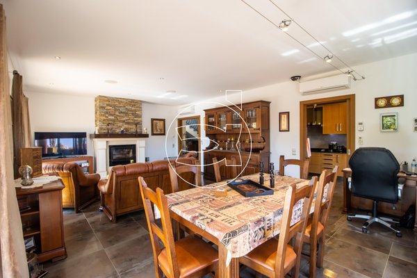 Im Erdgeschoss gelangt man über eine geräumige Eingangshalle in den Wohn- und Essbereich. Dieser verfügt über einen Holzkamin und große Schiebetüren, die viel natürliches Licht hereinlassen und zu einer großen überdachten Terrasse führen.