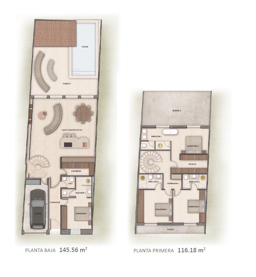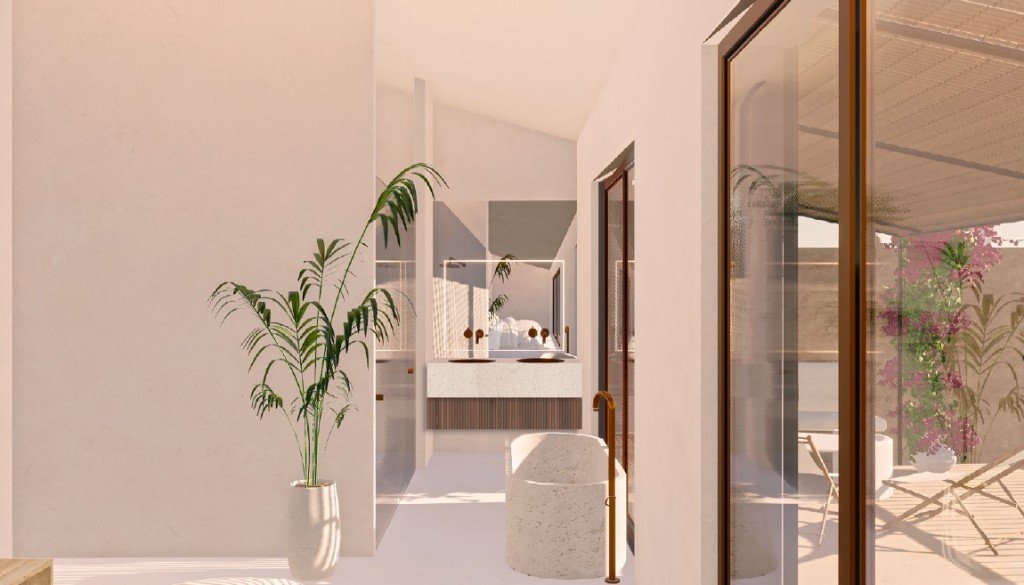 Im Obergeschoss befinden sich drei großzügige Doppelschlafzimmer, die jeweils mit einem eigenen Bad ausgestattet sind. Eines dieser Schlafzimmer verfügt zudem über einen begehbaren Kleiderschrank und eine private Terrasse, die ein Höchstmaß an Komfort und Privatsphäre bietet.