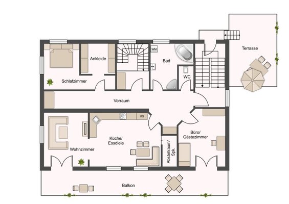 Die derzeitige Raumnutzung entspricht den Bedürfnissen der jetzigen Eigentümer. Natürlich können die Räume nach Belieben von Ihnen geändert und verwendet werden.
