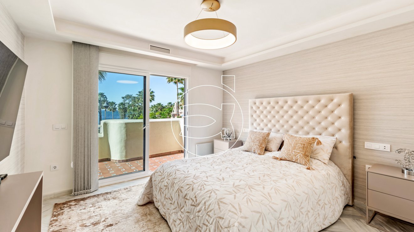 Auf der mittleren Etage bieten drei Schlafzimmer, darunter eine luxuriöse Hauptsuite mit Zugang zur Terrasse, faszinierende Meerblicke. Ein neu renoviertes Badezimmer dient den Gästezimmern.