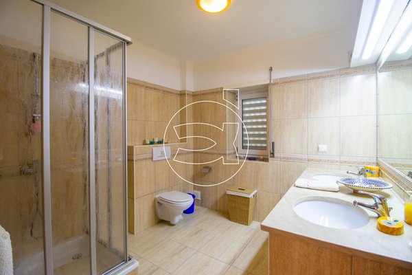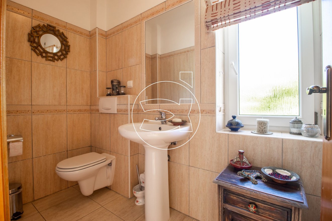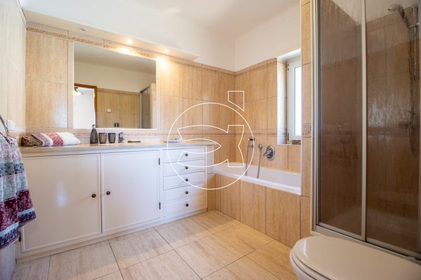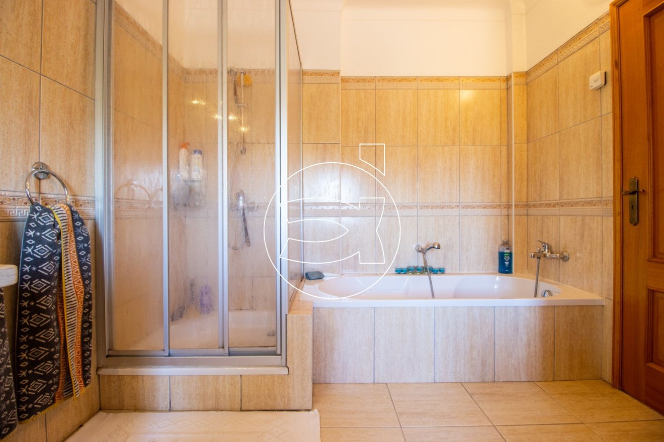 Schließlich gibt es im Erdgeschoss ein Schlafzimmer (Suite) mit Einbauschränken und ein Badezimmer (mit Badewanne und Dusche!). Das Wohnzimmer und das Badezimmer führen uns zu einem überdachten Balkon mit herrlicher Aussicht und Nachmittagssonne.
