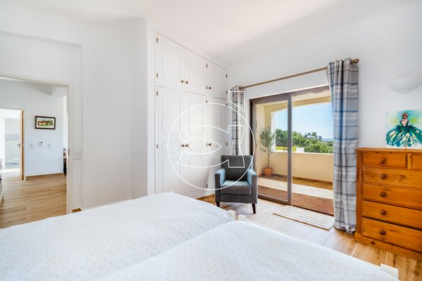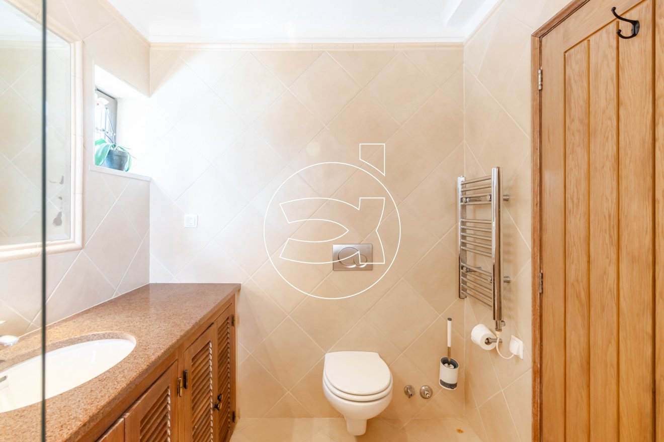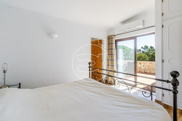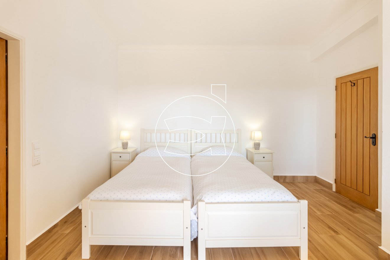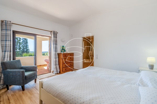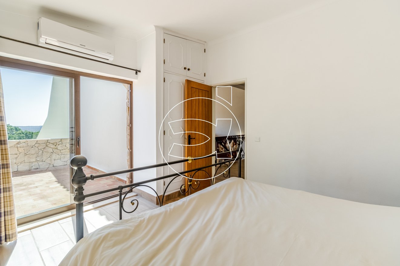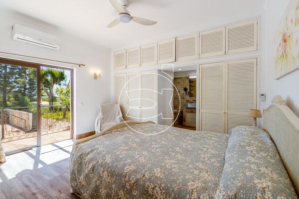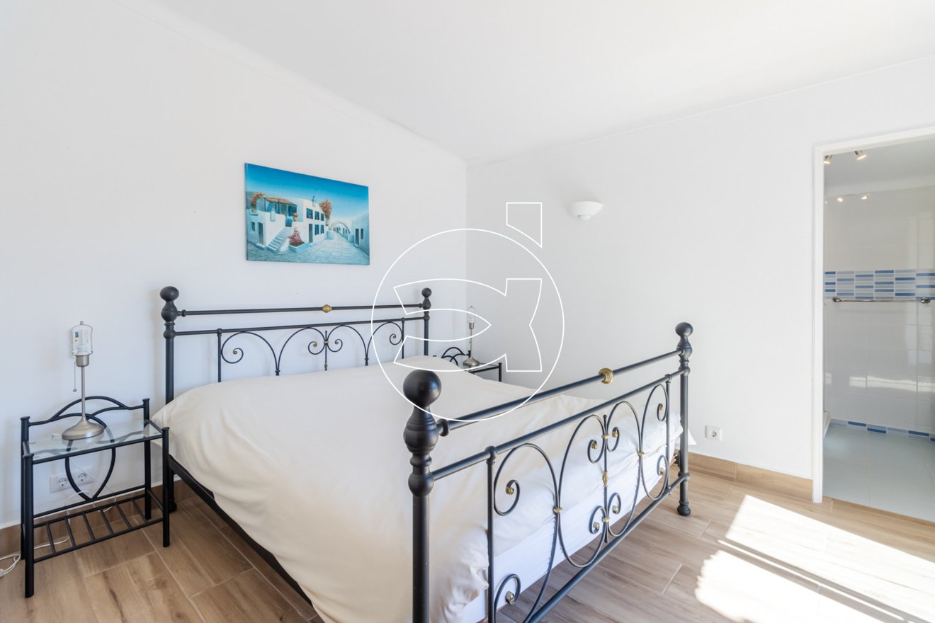 Das Hauptschlafzimmer mit eigenem Bad befindet sich ebenfalls auf dieser Ebene - es hat Einbauschränke und Zugang zur Terrasse.