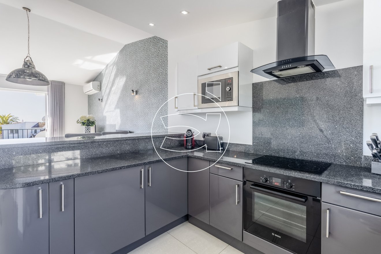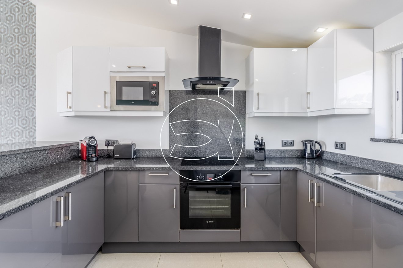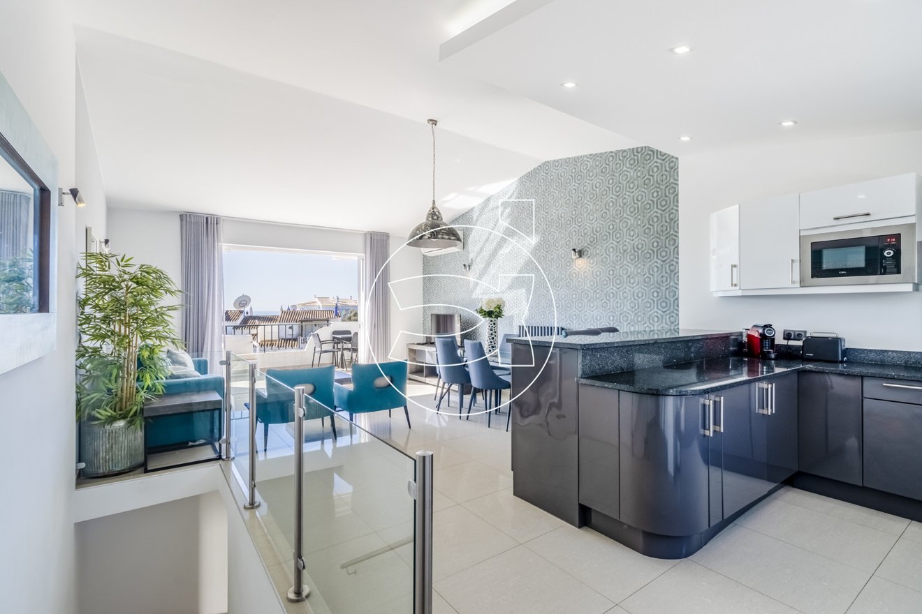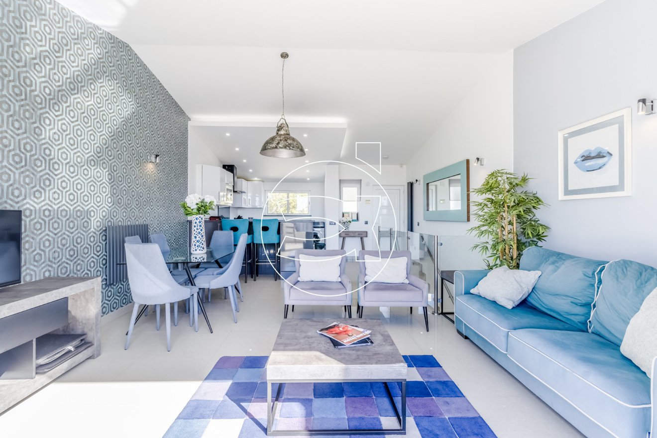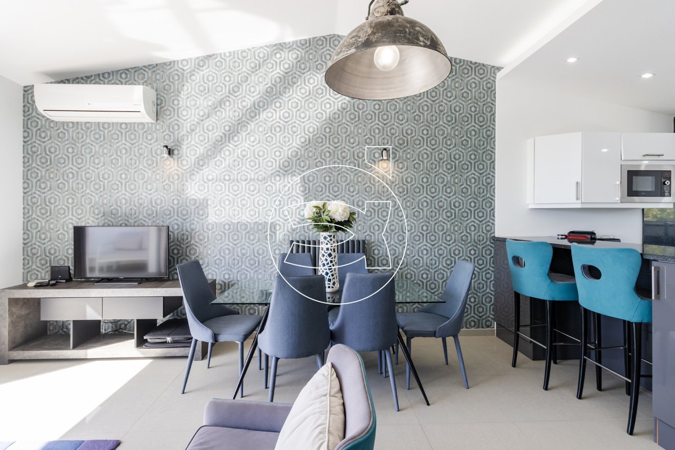 Im oberen Stockwerk befindet sich der Hauptwohnbereich, der aus einem offenen Grundriss besteht und eine voll ausgestattete Küche nahtlos mit dem Wohnbereich integriert.