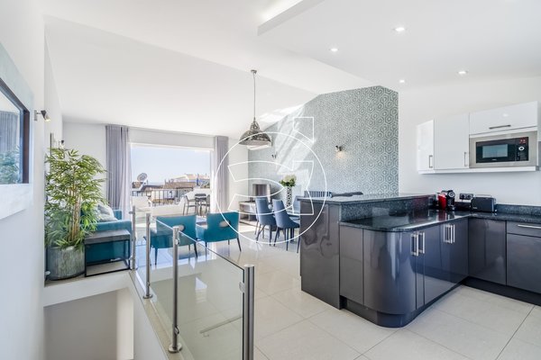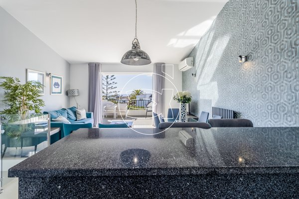 Dieser Bereich öffnet sich zu einer Terrasse mit Südlage und bietet atemberaubende Ausblicke auf die schwarzen Felsformationen sowie das Meer dahinter.