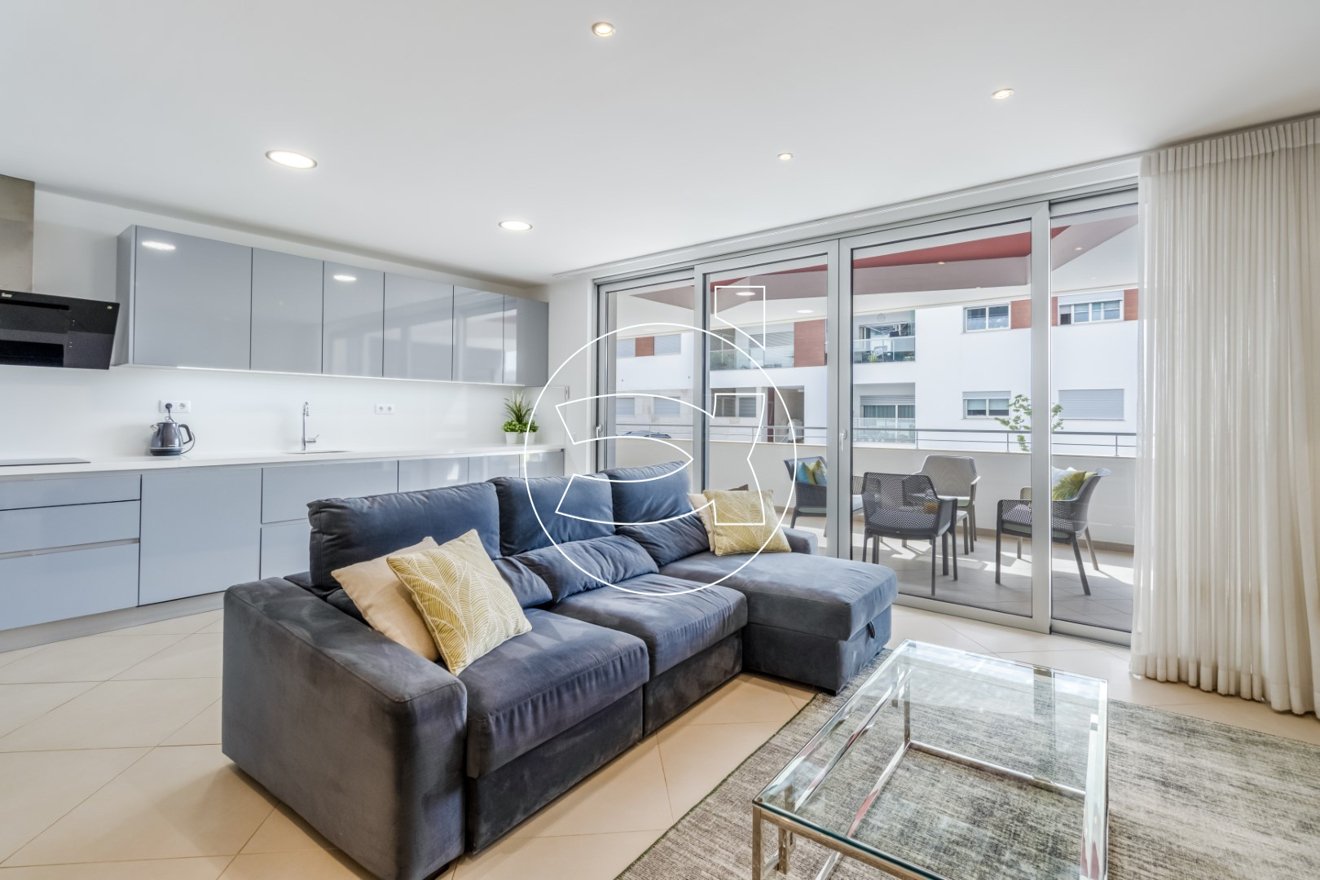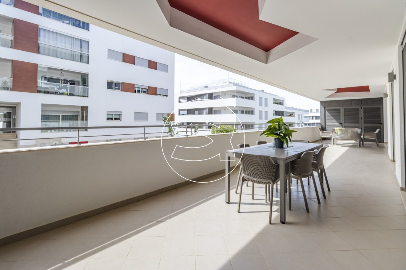 Große Glasschiebetüren führen auf einen riesigen Balkon, der perfekte Ort zum Essen im Freien sowie zum Entspannen.