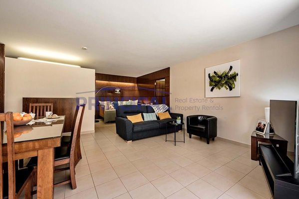 Bestehend aus Flur, Wohn- und Esszimmer mit offener Küche und Zugang zum Balkon mit Essbereich im Freien.