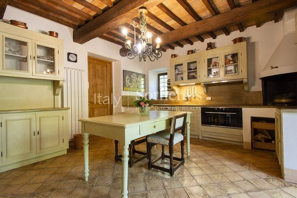 Eingebettet in die grünen Hügel der Toskana, zwischen den Dörfern Cetona und San Casciano dei Bagni, wo bereits die Römer und Etrusker ihre Siedlungen gründeten, befindet sich dieser historische Bauernhof aus dem 19. Jahrhundert, der eine Ecke des einzigartigen Paradieses bietet. Nur 2 km von den Dienstleistungen entfernt, ist es der ideale Ort für diejenigen, die einen Traumbauernhof in der Toskana möchten; man betritt das Anwesen durch einen echten Eichenpark, der einen sprachlos macht; von oben genießt man einen Panoramablick, der sich von Città della Pieve bis zum Monte Cetona erstreckt, der das Haus auf der Nordseite schützt. Die letzte größere Renovierung fand in den 2000er Jahren statt, und das Anwesen befindet sich in einem ausgezeichneten Erhaltungszustand; am Eingang führt das Esszimmer zur großen Küche mit Zugang zum Außenessbereich, wo unter einer Pergola aus Weinblättern der Grillplatz zu finden ist. Vom Erdgeschoss aus kann man in den Keller gehen, wo sich das Wohnzimmer befindet: ein beeindruckender Raum, der aus den alten Stallungen entstanden ist, wobei die Decke bewusst bis zum zweiten Stock geöffnet wurde, um die gesamte Höhe der Struktur zu schätzen. Auch im Untergeschoss befindet sich ein romantisches Zitronenhaus, das zum Garten hin offen ist und im Winter einen gemütlichen Ort bietet, mit einem Bad und einem Arbeitszimmer. Im Erdgeschoss finden wir auch ein Schlafzimmer mit eigenem Bad, das von außen oder über drei Stufen im Inneren erreichbar ist. Die erste Etage ist sowohl intern als auch extern über zwei Treppen verbunden, die zu zwei Panoramaterrassen führen. Auf dieser Etage befindet sich der Schlafbereich, der aus einem Hauptschlafzimmer mit eigenem Bad und Balkon, einem Wohnbereich/Bibliothek und einem zweiten Schlafzimmer mit Zugang zur Terrasse besteht. Die Aussicht aus den Fenstern ist wie natürliche Gemälde, und der Frieden ist absolut.