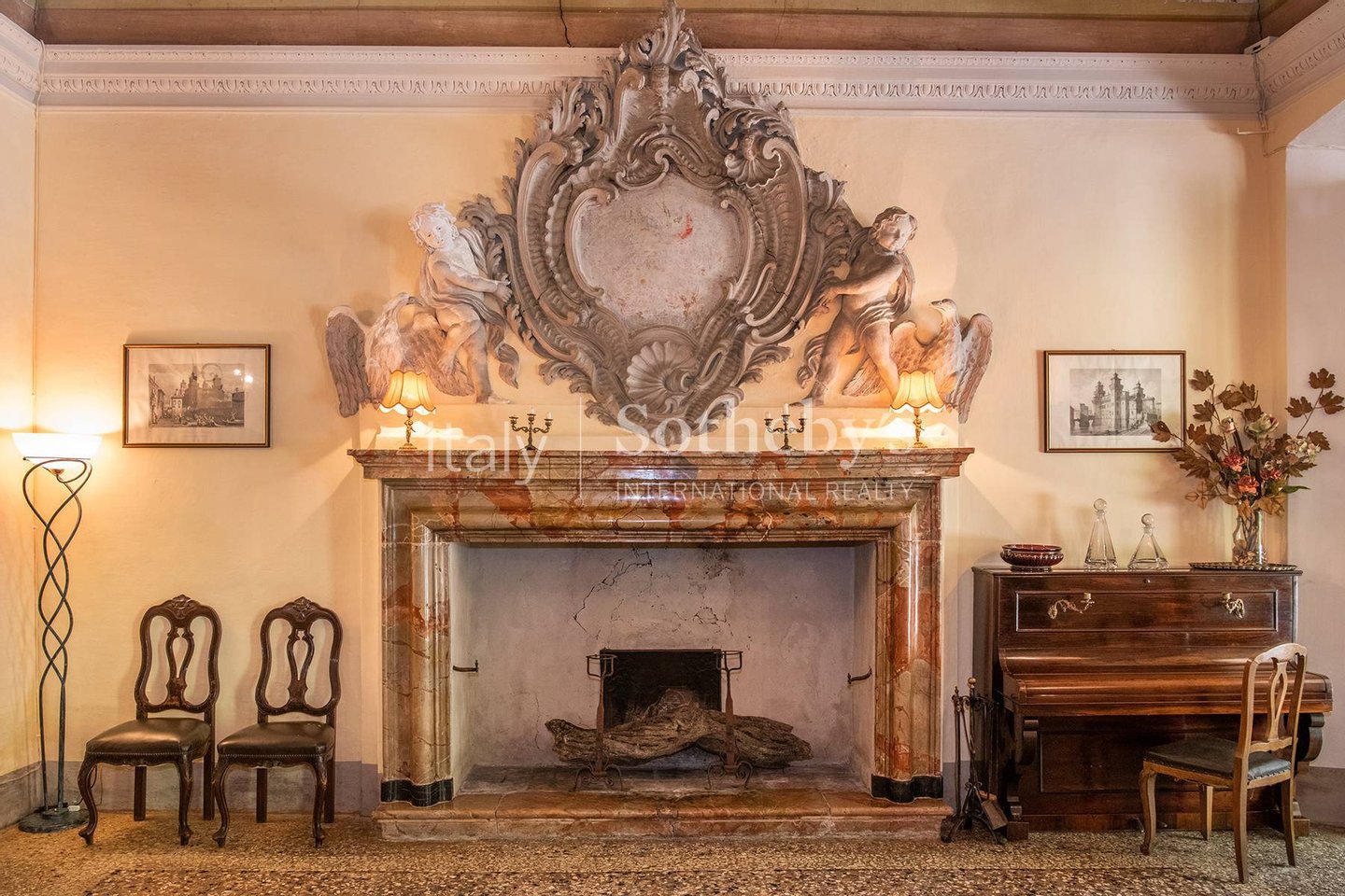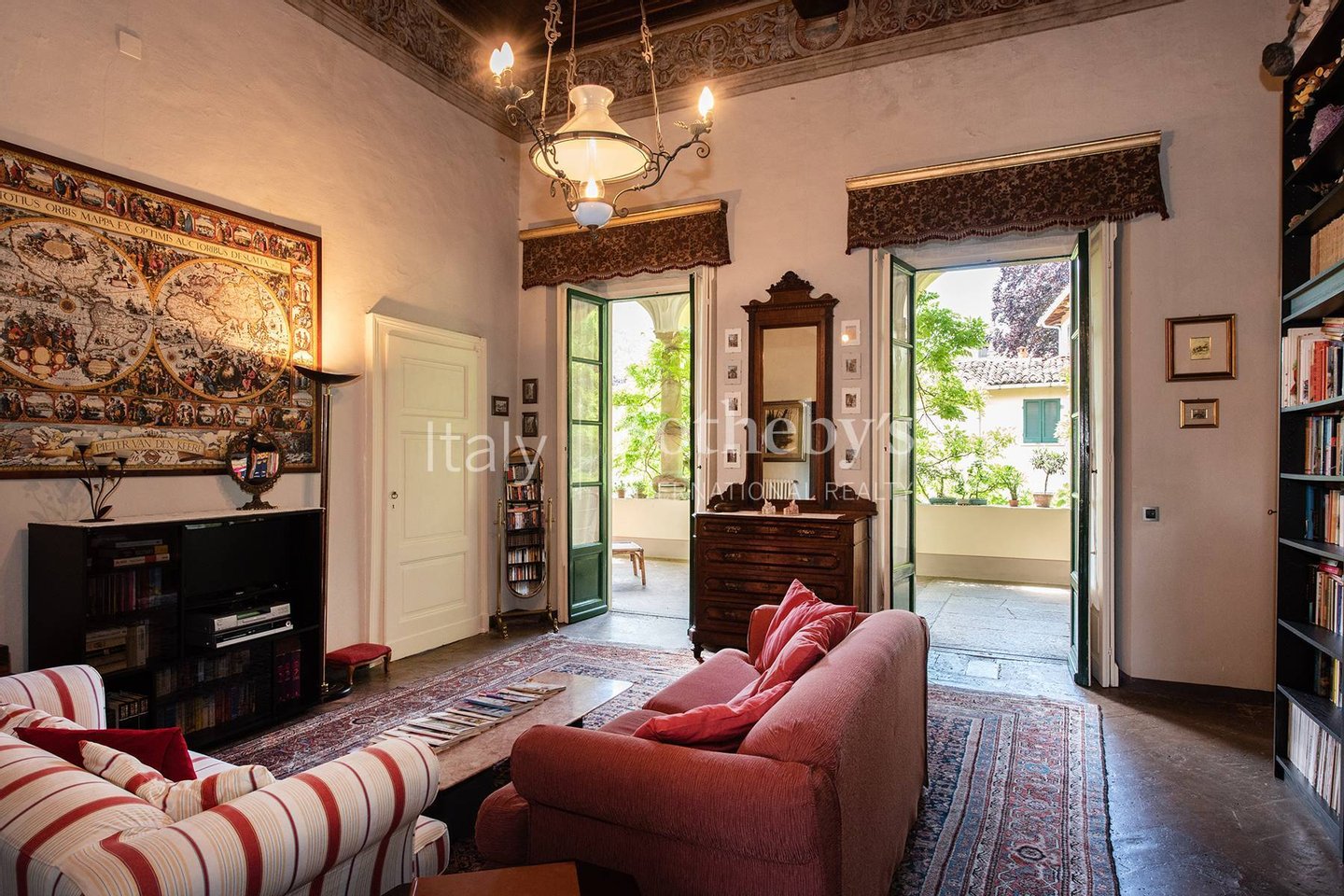 Ein paar Kilometer von der Stadt Varese und dem Flughafen Mailand Malpensa entfernt, eingebettet in das Grün eines alten Dorfes, liegt die kleine Stadt Castello Cabiaglio. In dieser malerischen Umgebung finden Sie eine majestätische Residenz, die sich über 4 Etagen erstreckt (Erdgeschoss, Zwischengeschoss, erster Stock und Dachboden) mit einer Gesamtfläche von etwa 1.100 Quadratmetern, umgeben von 3.900 Quadratmetern Garten. Im Erdgeschoss empfängt ein geräumiger Innenhof die Besucher mit einer markanten grünen Wand und einem zentralen Brunnen. Der gewölbte Portikus, gepflastert mit Steinplatten, führt zu den Hauptzimmern, darunter ein elegantes Wohnzimmer, das als Esszimmer genutzt wird, bereichert mit ornamentalen Stuckaturen und einem funktionierenden Kamin. Ein weiteres Esszimmer, das mit Motiven aus dem 17. Jahrhundert dekoriert ist und über einen Marmor-Kamin verfügt, verleiht der Umgebung zusätzlichen Charme. Der Marmor- und lombardische Terrakottaboden verleiht einen Hauch von großer Raffinesse. Das Zwischengeschoss beherbergt ein Schlafzimmer und ein privates Badezimmer, während der Dachboden mit seiner Holzkonstruktion Potenzial für eine Nutzung mit einigen Modifikationen bietet. Der erste Stock verfügt über eine große Panorama-Loggia, von der aus man Aussicht auf die Stadt und die umliegenden Täler genießen kann, und umfasst den Hauptsaal mit einem Kassettendecken, die mit den Wappen der Familien Visconti-Sforza von Mailand und Ronchelli verziert ist. Ein Leseraum, drei Schlafzimmer und ein Badezimmer bereichern den ersten Stock.