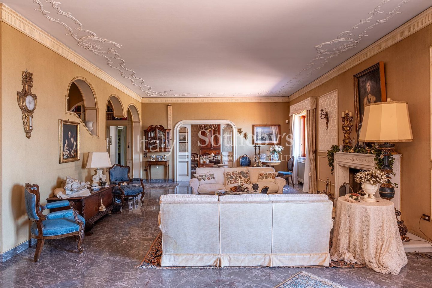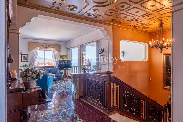 An der renommierten Via Giovenale in Posillipo befindet sich diese beeindruckende Villa. Die Immobilie erstreckt sich über drei Ebenen. Eine malerische Eingangstreppe führt zum Eingang des Hauses, der direkt in die große Empfangshalle öffnet, die über eine Terrasse auf gleicher Ebene verfügt, von der aus man die umliegende Landschaft genießen kann. Auf derselben Etage befindet sich auch das Esszimmer, das mit dem Wohnzimmer und der großen und funktionalen Küche verbunden ist und eine sehr durchdachte und rationale Aufteilung aufweist. Die Terrasse auf dieser Ebene ist groß, hell und bietet einen Panoramablick, wodurch der ohnehin schon großzügige Empfangsbereich noch erweitert wird. Ein Gästebad vervollständigt die zweite Etage. Eine prächtige Treppe führt in die zweite Etage, wo sich der Schlafbereich befindet. Letzterer windet sich um eine reizvolle Panoramaloggia. Es gibt vier Schlafzimmer. Das Hauptschlafzimmer verfügt über ein eigenes Bad und einen begehbaren Kleiderschrank. Weitere 3 Schlafzimmer, 2 Badezimmer und ein Wohnzimmer vervollständigen die Etage. Das Erdgeschoss ist hingegen in zwei verschiedene Bereiche unterteilt. Der erste Bereich ist durch eine Innentreppe mit der Villa verbunden und besteht aus einem multifunktionalen Raum, einem Servicebereich und einer Garage. Der zweite Bereich ist eine Dependance, die aus einem Wohnzimmer, einer Küche, einem Badezimmer und einem Schlafzimmer besteht.
