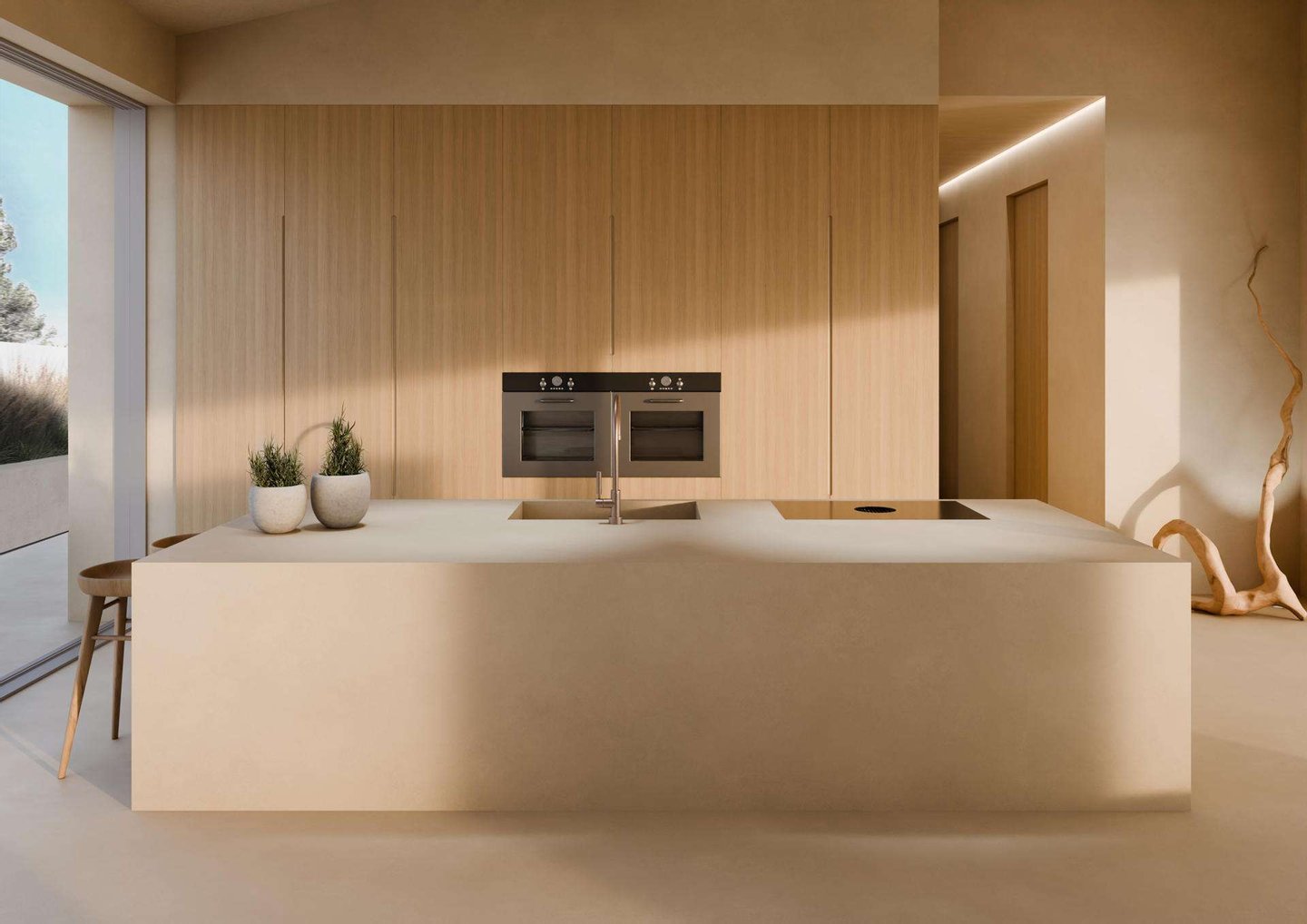 Betreten Sie dieses architektonische Meisterstück und lassen Sie sich von der nahtlosen Integration natürlicher Oberflächen begeistern. Ses Pins ist ein Juwel des warmen Minimalismus. Der helle Bodenbelag harmoniert perfekt mit den Wänden und der Decke und verleiht dem Innenraum einen ganz besonderen Charakter von Ruhe, Wärme und Entspannung.