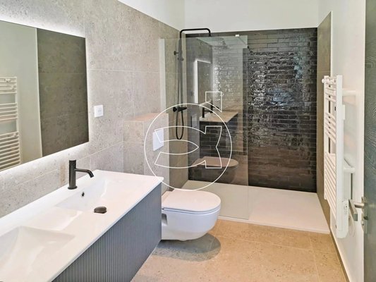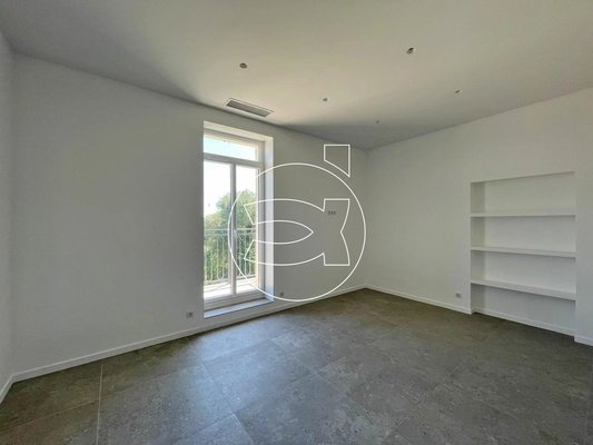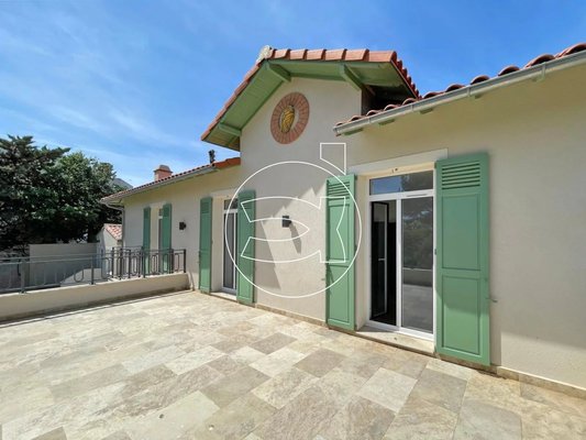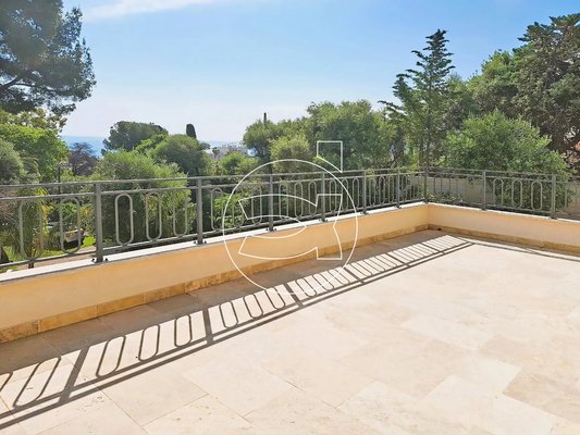 Im Obergeschoß befinden sich 3 Schlafzimmer mit Duschbad und Abstellraum sowie eine große Terrasse mit einem schönen Blick auf das Meer und das Kap "Cap d'Antibes".