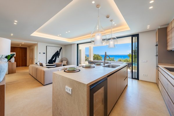 Die Villa besteht aus zwei Stockwerken und einem Kellergeschoss. Im Erdgeschoss befinden sich ein geräumiges, offenes Wohnzimmer mit bodentiefen Fenstern, ein Essbereich und eine erstklassige Einbauküche. Von hier aus gelangt man direkt auf die überdachte Terrasse mit Blick auf das Meer. Außerdem befinden sich auf dieser Ebene ein Doppelschlafzimmer mit eigenem Bad und ein Gäste-WC.