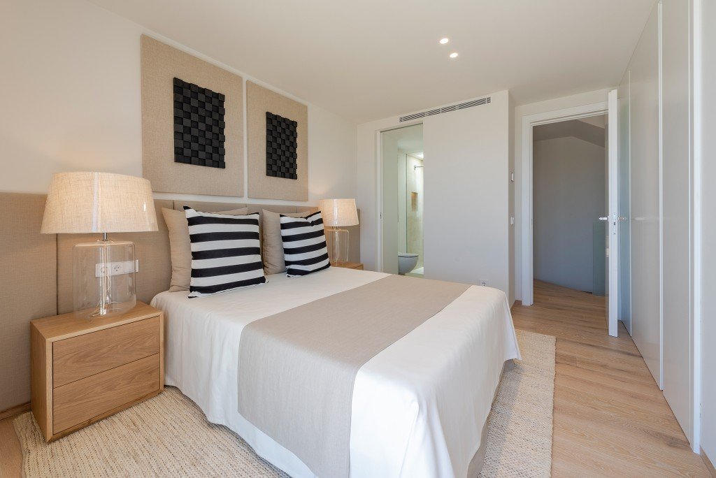 Das Hauptschlafzimmer mit eigenem Bad und privater Terrasse befindet sich im ersten Stock, zusammen mit zwei Gästeschlafzimmern, die ebenfalls über ein eigenes Bad verfügen.