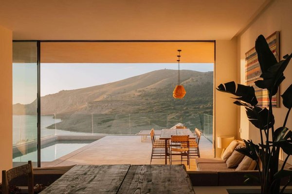 Im obersten Geschoss öffnet sich das Wohnkonzept vollständig: Küche, Ess- und Wohnbereich sind offen gestaltet und fließen ineinander über. Eine sechs Meter breite Glasfront lässt den Innenraum mit der Terrasse und dem Meerblick verschmelzen. Die Westterrasse bietet Abendsonne und Ausblick in den Kiefernwald – ideal für entspannte Stunden. Die Ostterrasse begeistert mit einem spektakulären Blick auf die Bucht und beherbergt den Salzwasserpool mit modernem Pyrolysesystem.