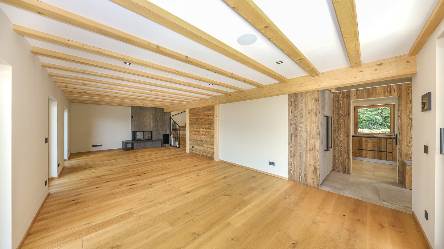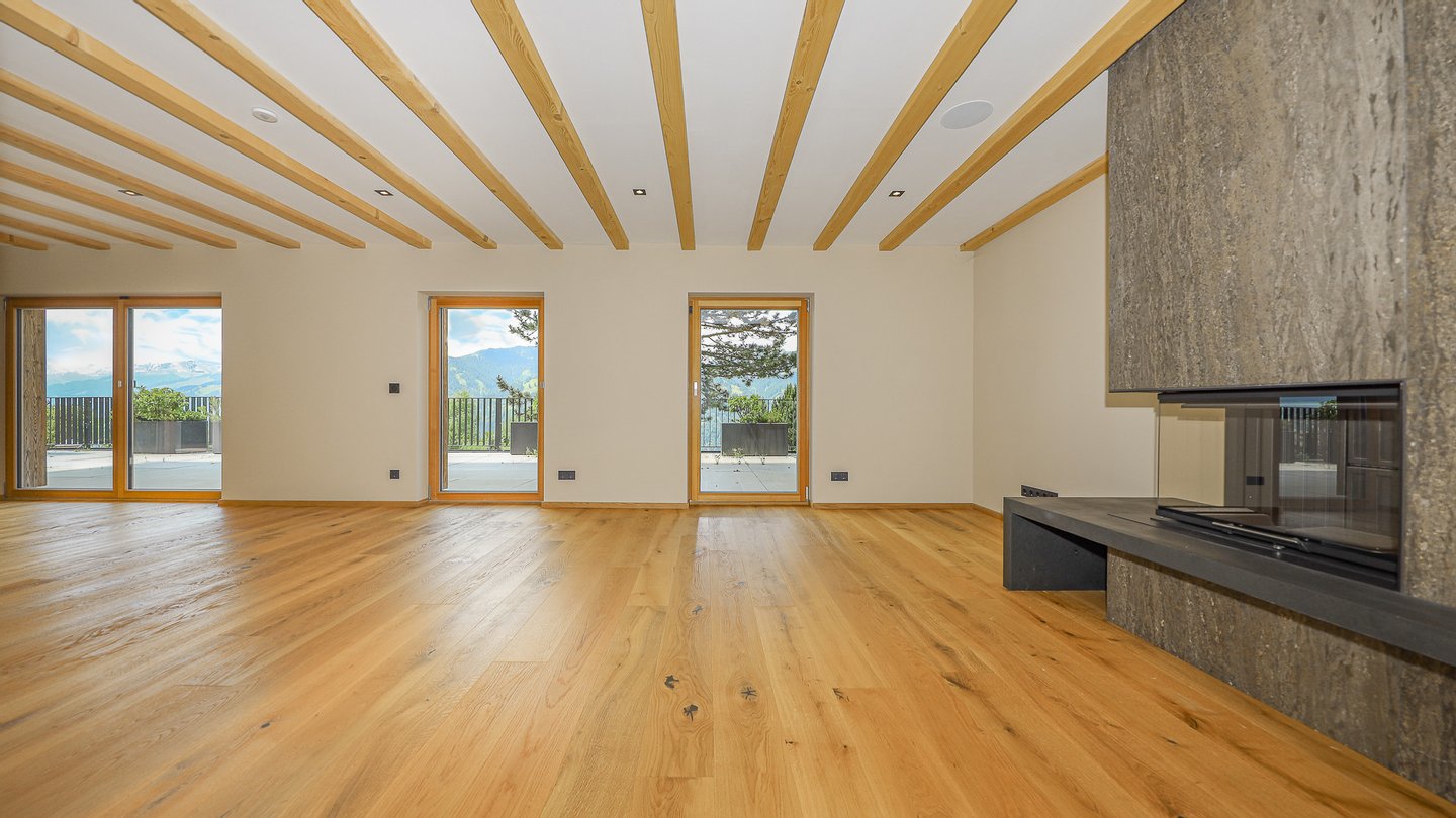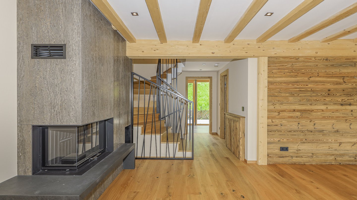 Man gelangt in eine Garderobe mit Einbauschränken und weiters in die angrenzende Küche, ausgestattet mit allen Geräten und sodann in den großen Wohnbereich mit Kamin und zahlreichen Fenstern, durch welche man einen phantastischen Blick auf die Kitzbüheler Alpen hat. Weiters befindet sich auf dieser Ebene eine Gäste-Toilette sowie ein Wellnessbereich mit Dusche, Badewanne, Dampfbad und Sauna sowie einer Terrasse. Eine weitere ca. 95 m² große, ost/süd/west-seitig gelegene Terrasse umgibt den gesamten Wohnbereich und bietet einen atemberaubenden Rundumblick..