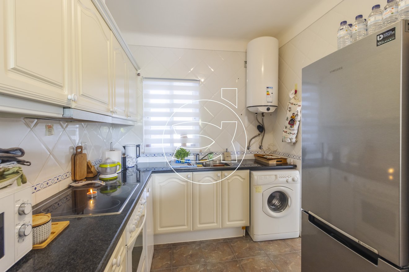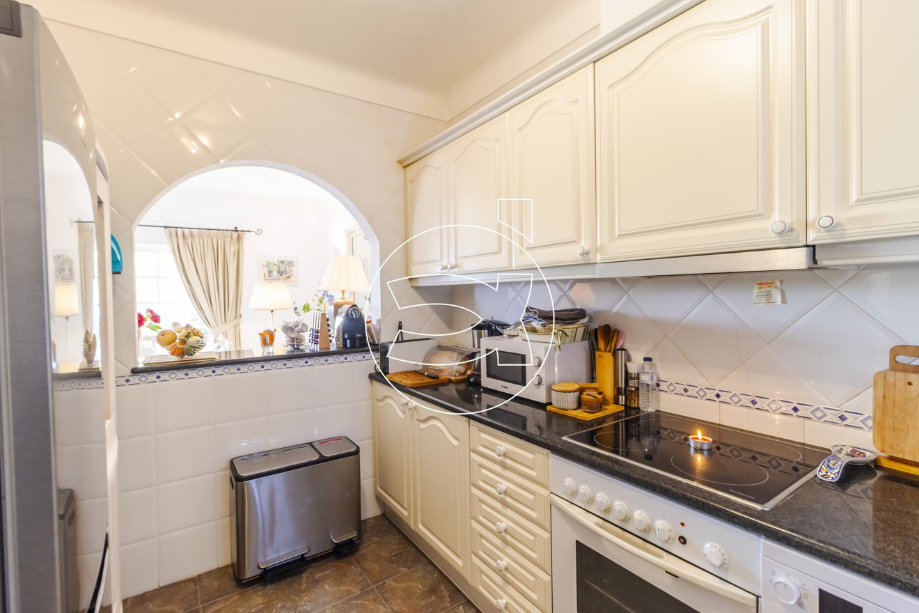 Eine halboffene, traditionell ausgestattete Küche erwartet Sie, nahtlos in den Wohnraum integriert, bietet sie sowohl Komfort als auch Stil.