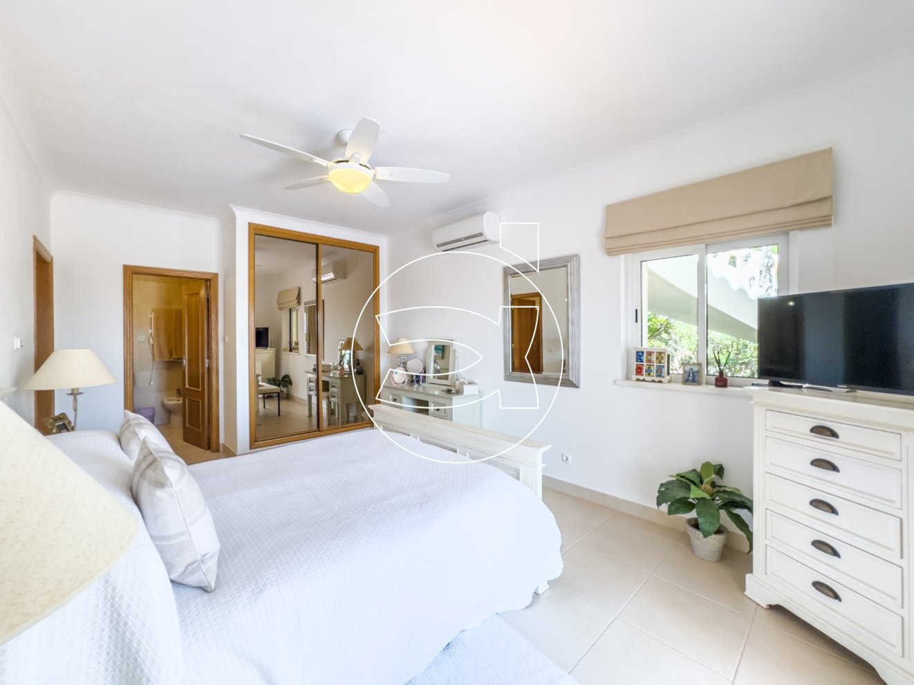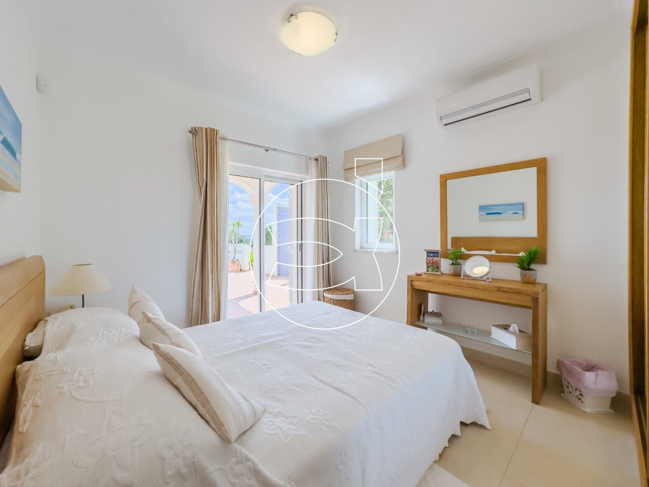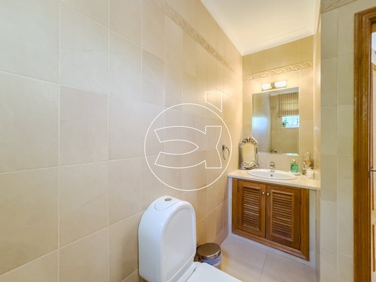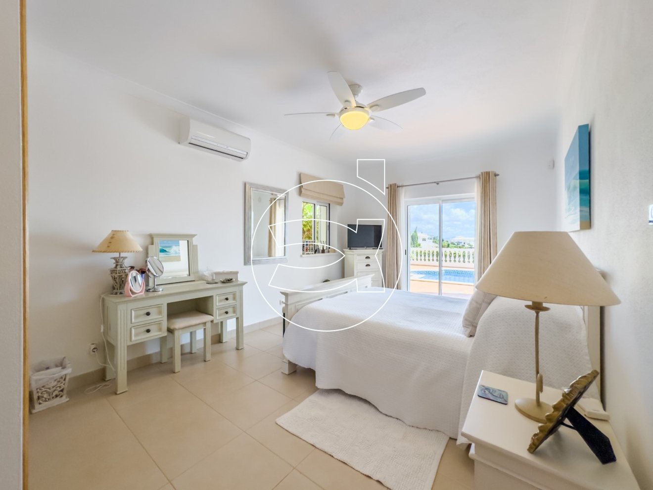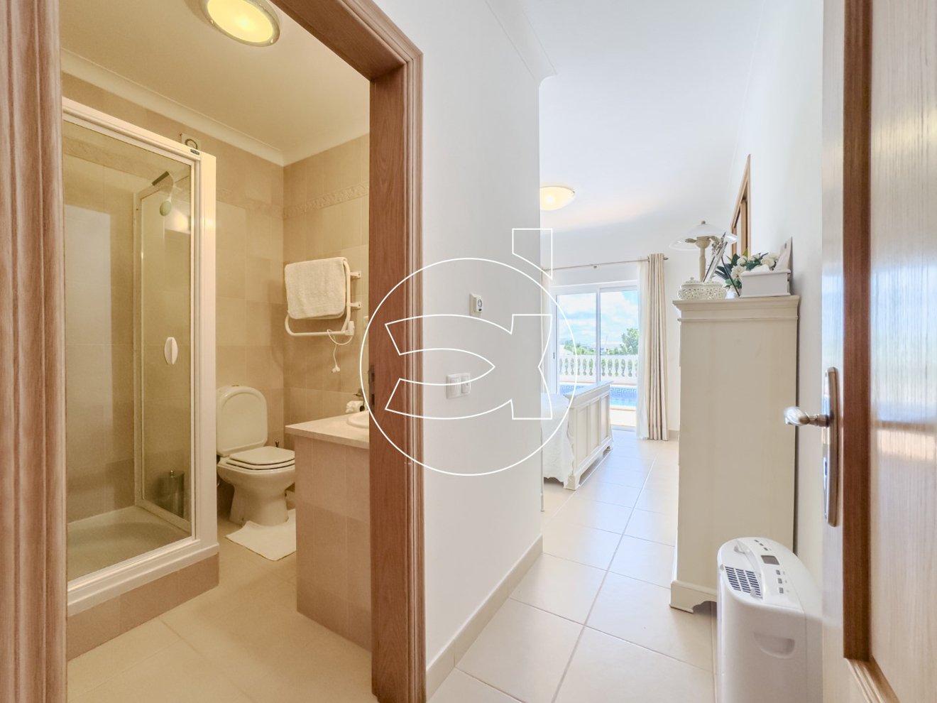 Im Erdgeschoss befinden sich 3 großzügige Doppelschlafzimmer, jedes mit eigenem Bad und Einbauschränken. Von diesen Schlafzimmern aus gelangt man direkt auf die einladende Poolterrasse, die auch von der oberen Etage aus zugänglich ist.