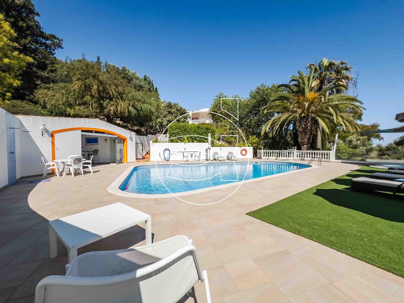 Der Außenbereich dieser Immobilie ist für Luxus und Entspannung konzipiert, mit einem großen, abgelegenen beheizten Swimmingpool, einem Jacuzzi und einer Poolbar mit Gästebad.