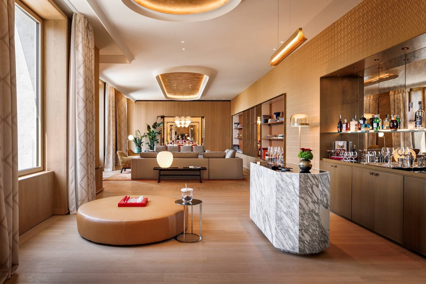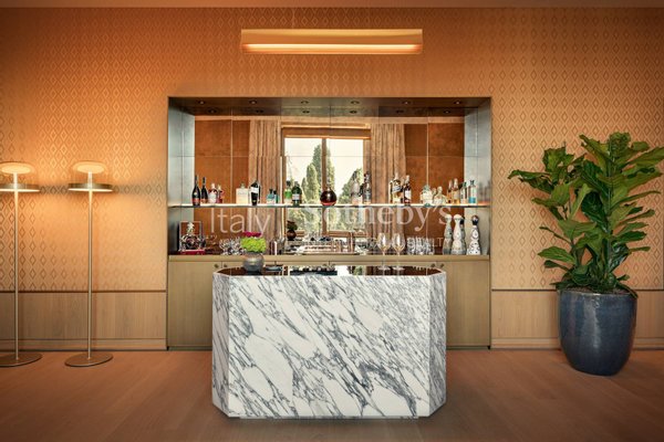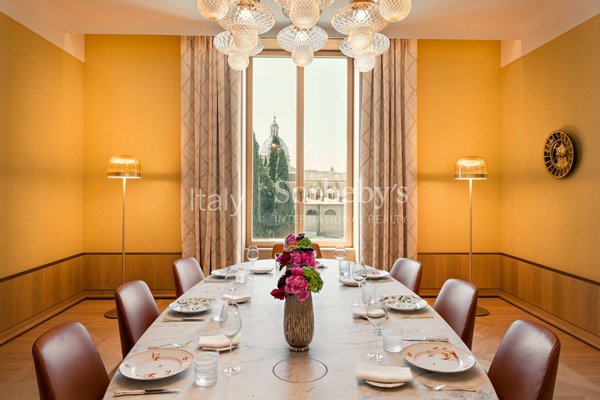 Die Suite umfasst auch eine private Küche, eine Bartheke und ein großes Esszimmer mit einem Marmortisch, ergänzt durch Originalplatten aus der Ginori-Serie der 1930er Jahre, entworfen von Gio Ponti.