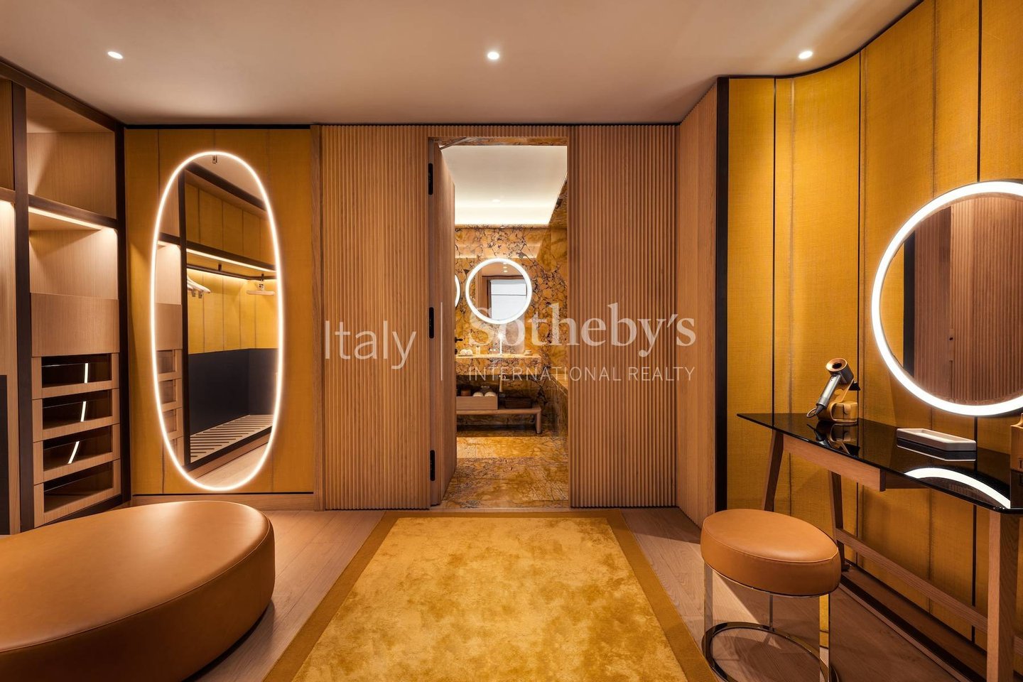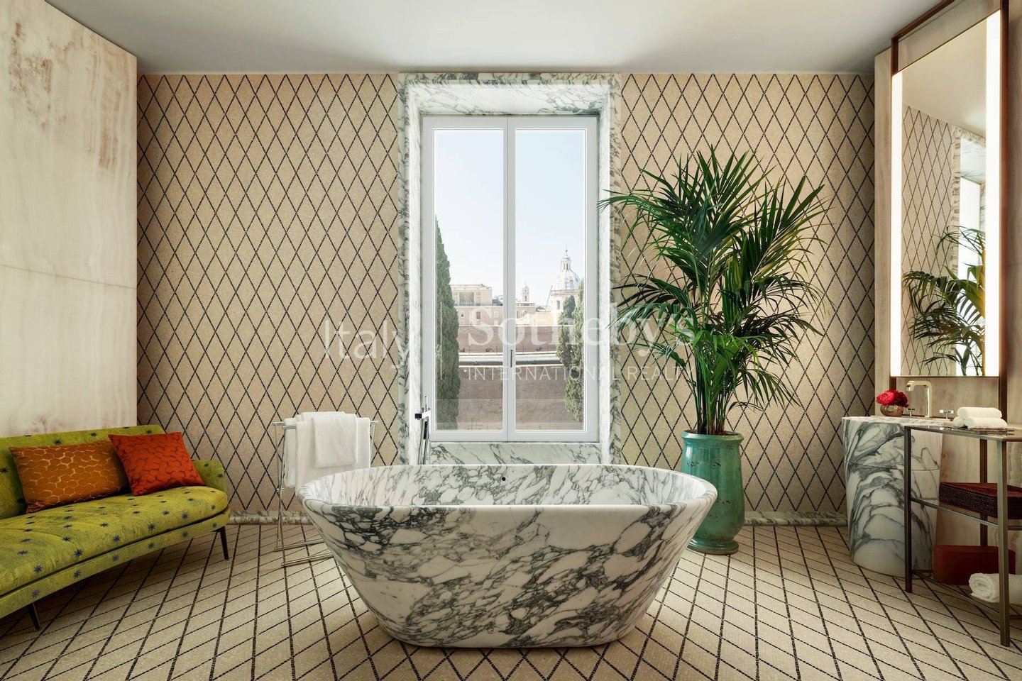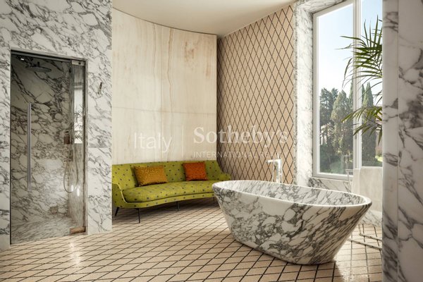 Das Hauptschlafzimmer verfügt über einen eleganten begehbaren Kleiderschrank, ein geräumiges Badezimmer mit einem Schminkecke, einem Dampfbad, einer Dampfdusche und einer atemberaubenden Badewanne, die aus einem einzigen Block aus arabesken Corchia-Marmor gefertigt wurde, inspiriert von den Caracalla-Thermen.
