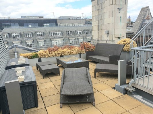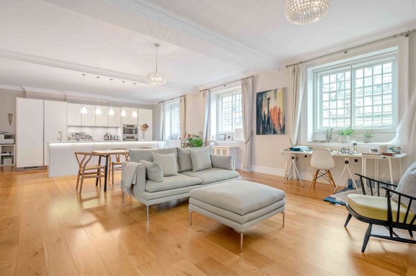 Eine Wohnung im Manhattan Loft-Stil im 3. Stock in diesem historischen, von Lutyens entworfenen Gebäude im italienischen Stil am Kingsway neben Covent Garden. Schneller Gemeinschaftsaufzug. Zwei Schlafzimmer, eine große offene Küche, ein Ess- und Wohnzimmer und Zugang zu einer gemeinsamen Dachterrasse. Klimatisiert.
