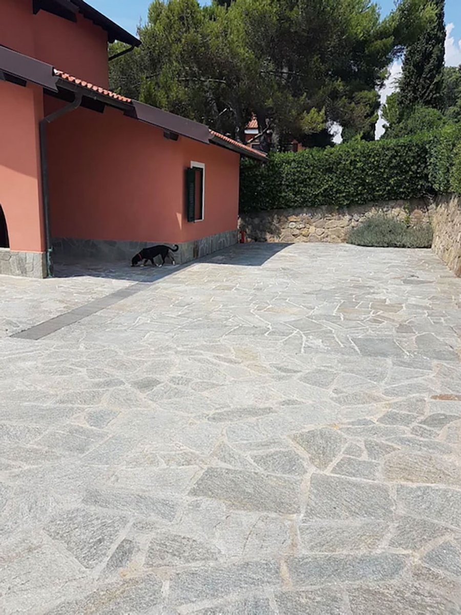 Neben dem Haus befindet sich der Eingang des Anwesens mit einem elektrischen Tor und einem großen privaten Parkplatz für 4 Autos.