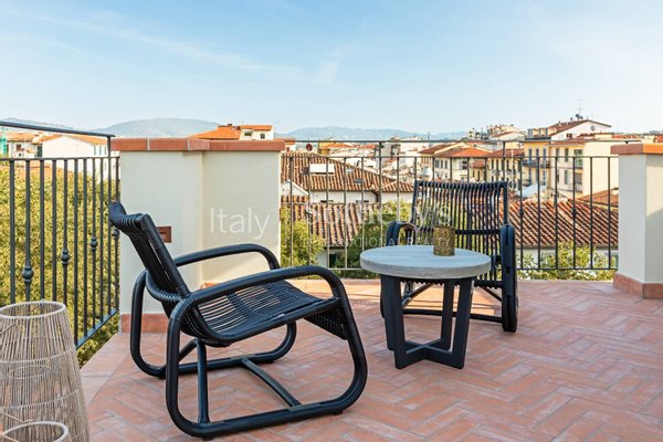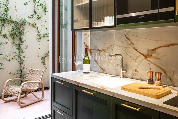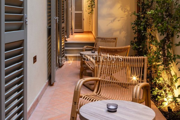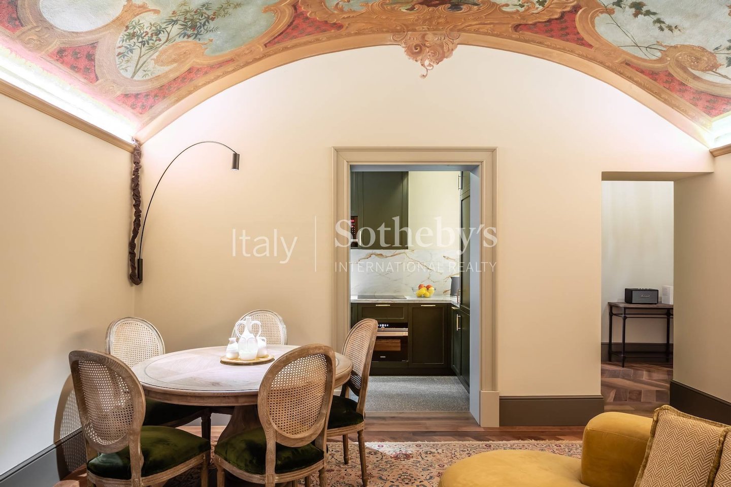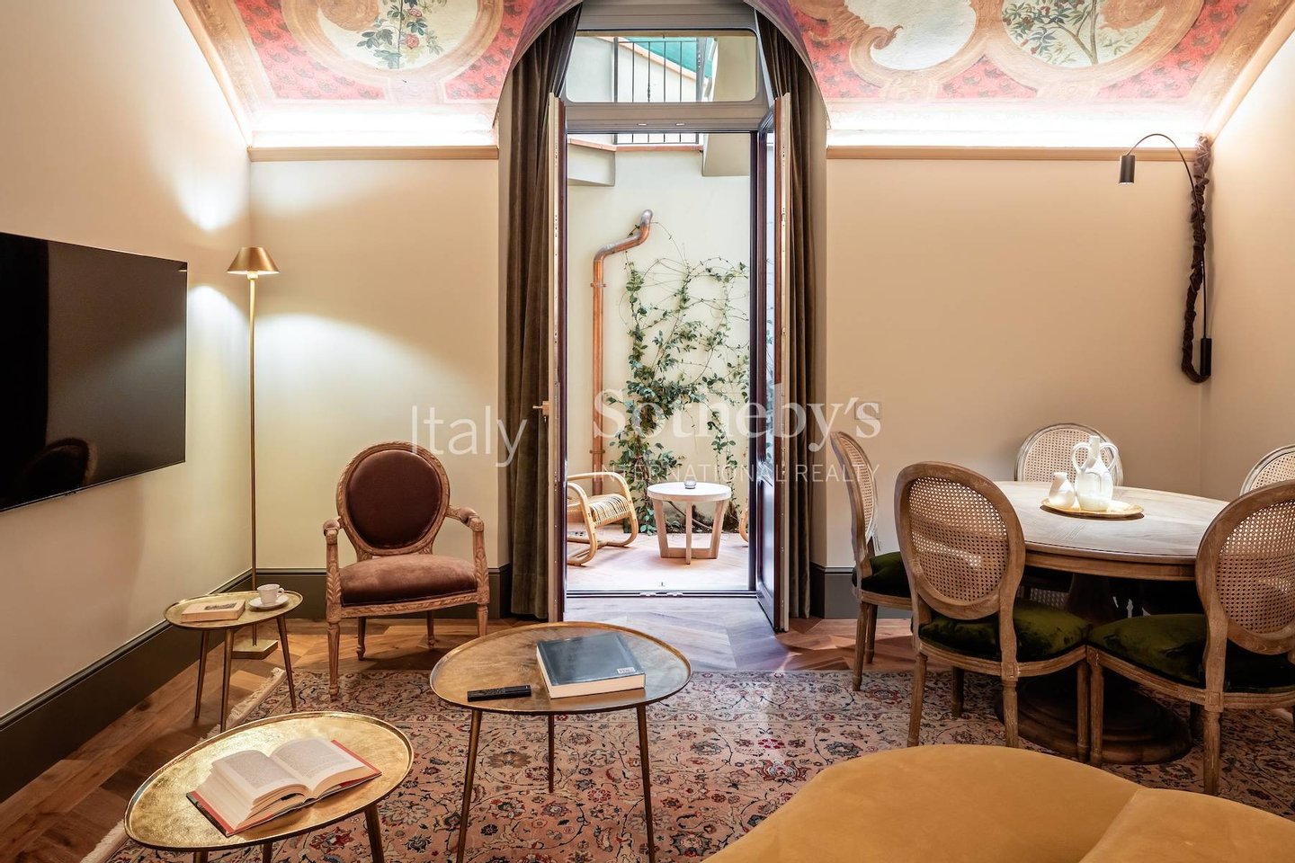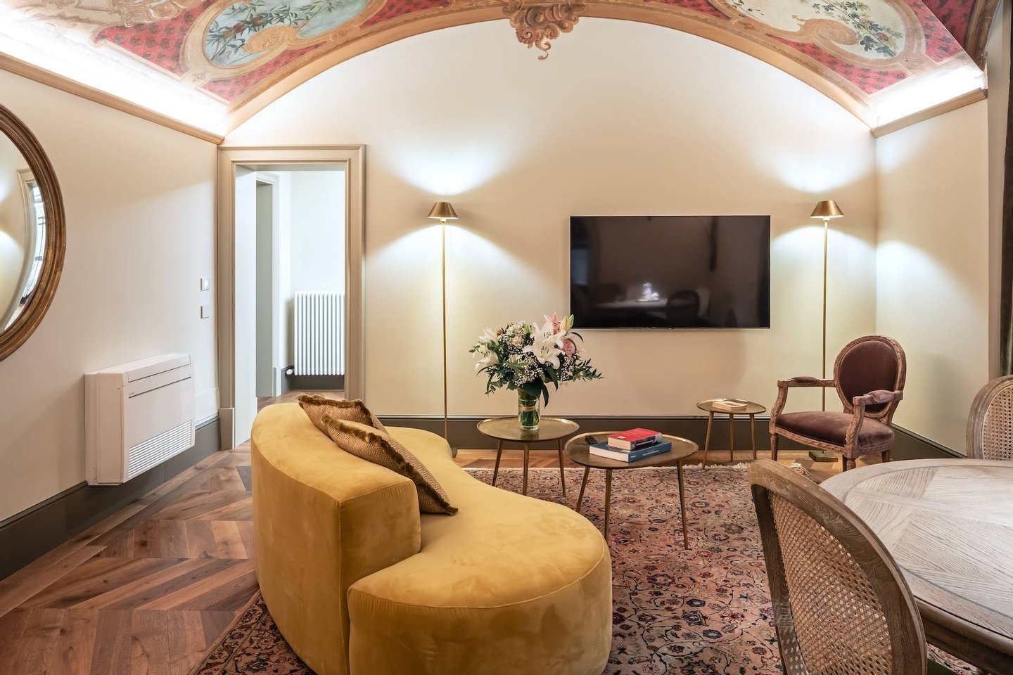The inviting living area is designed for relaxation and comfort, featuring plush sofas beneath a stunning curved ceiling fresco. The restored ceiling artwork, adorned with intricate details of olives and grapes, presents a garden scene that beautifully complements the modern interior. This serene space seamlessly connects to a private outdoor garden terrace (30 sqm), where the gentle breezes enhance the tranquil atmosphere.