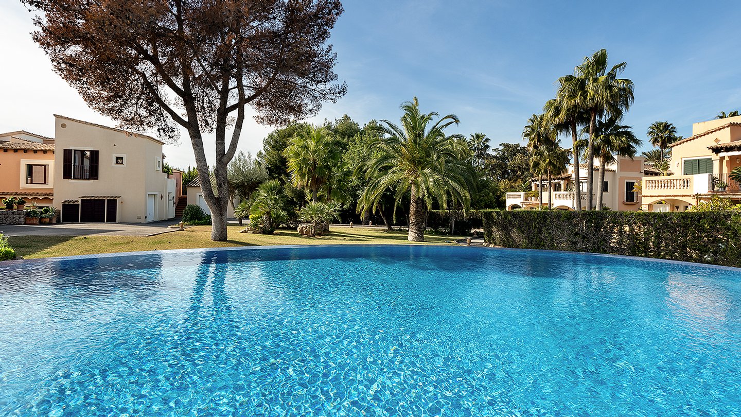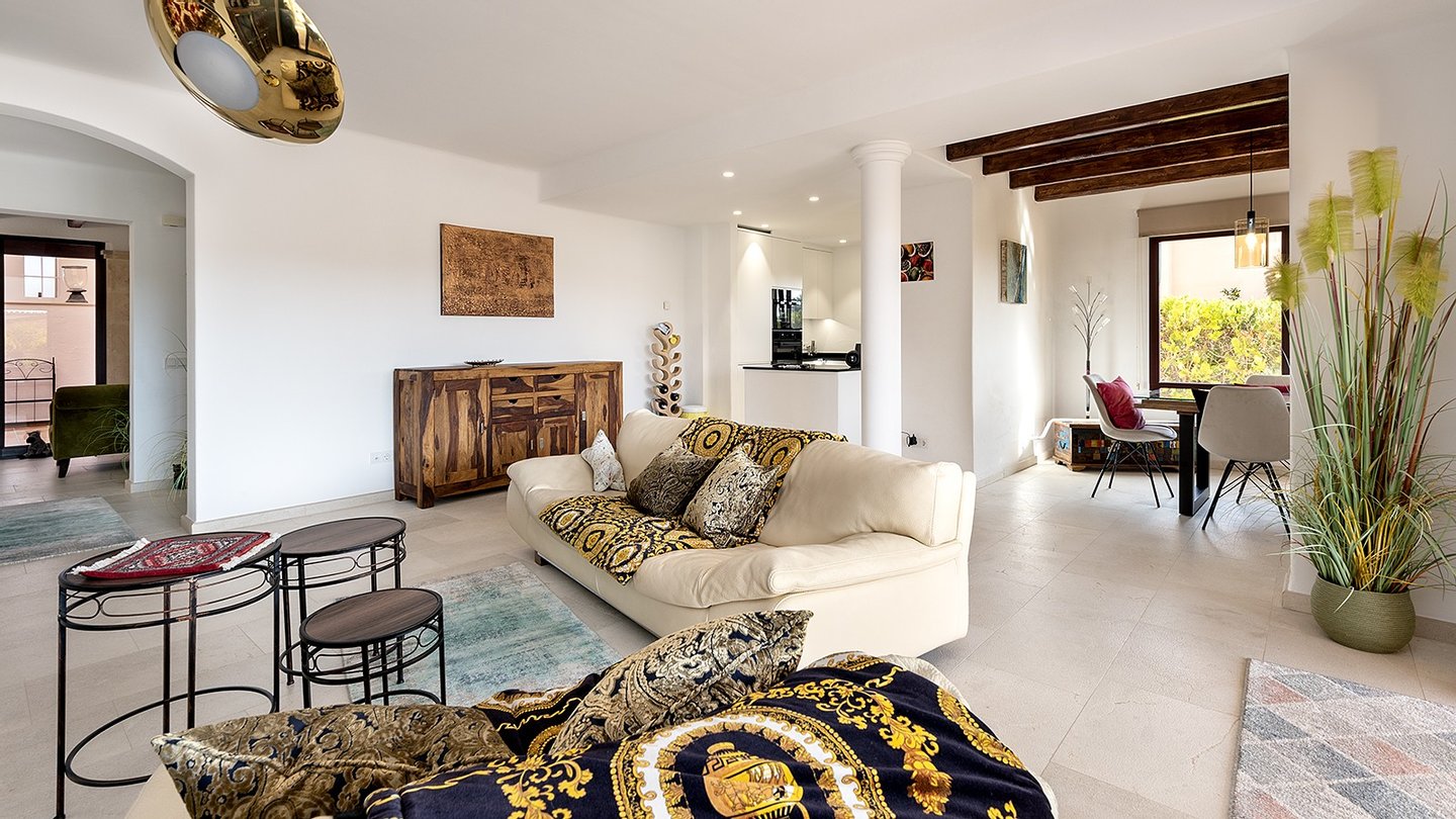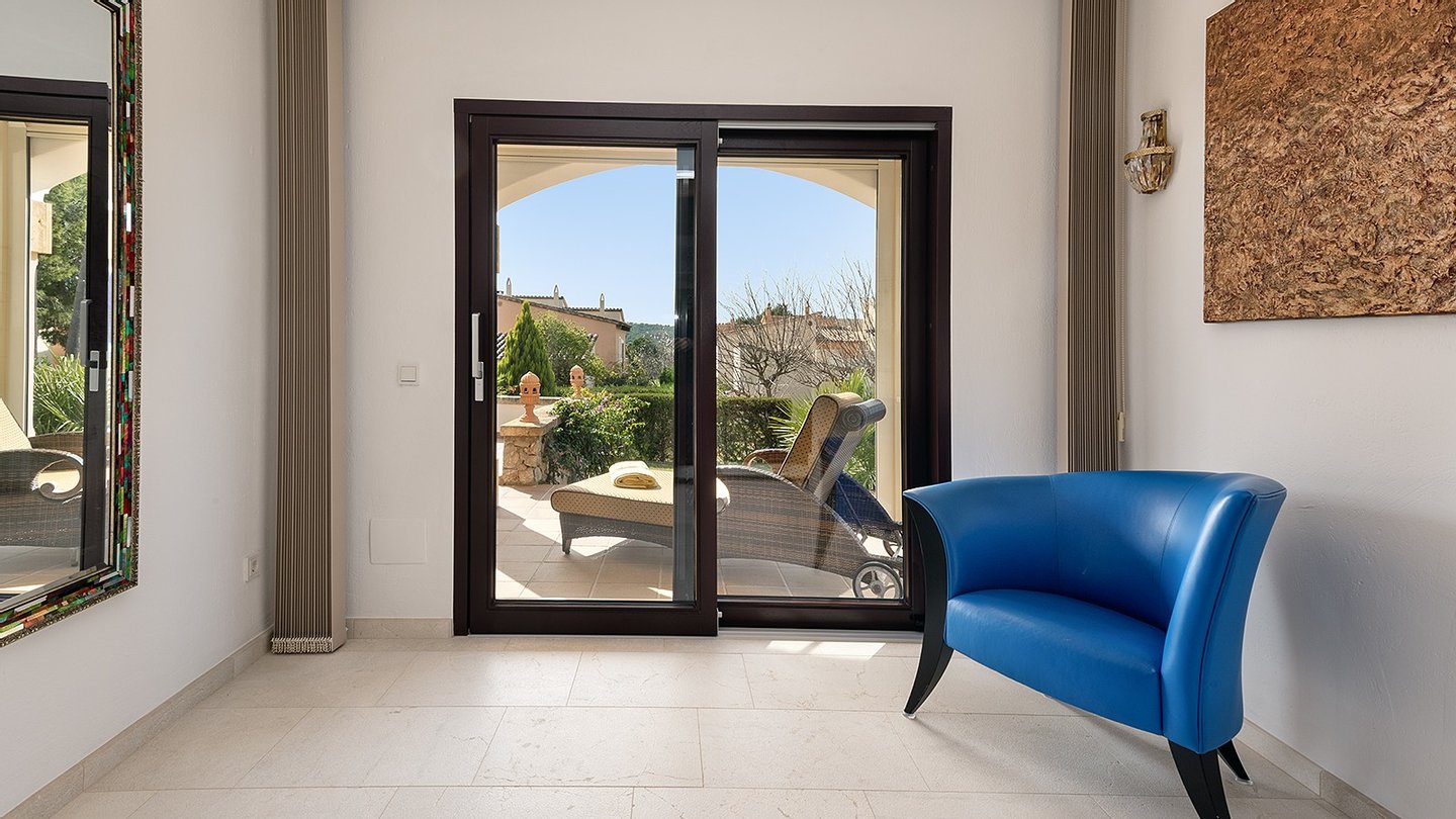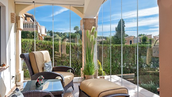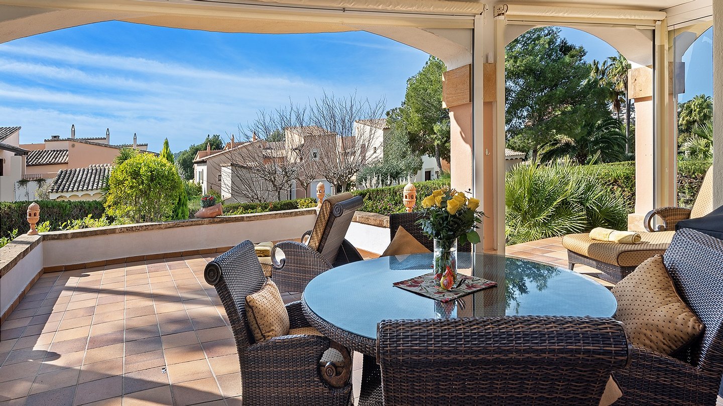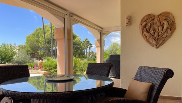 Mallorca Immobilien: Dieses elegante Erdgeschossapartment befindet sich in einer beliebten Golfresidenz direkt am Golfplatz von Santa Ponsa im Südwesten von Mallorca. Die Immobilie wurde mit viel Liebe zum Detail dekoriert und umfangreich renoviert.Die moderne Innenausstattung, die großzügige Raumaufteilung auf einer Ebene und ein eigener Garten zeichnen diese Mallorca Immobilie aus. Auf einer Wohnfläche von ca. 210 m2 verteilen sich 3 Schlafzimmer, Ankleide, 3 Bäder (2 davon en suite), ein Gäste-WC, ein heller Wohn- Essbereich, eine offene moderne Einbauküche mit Elektrogeräten von Miele, ein Hauswirtschaftsraum und ein Abstellraum. Die Traumimmobilie besticht durch ihre hochwertige Einrichtungsqualität, sowie ein luxuriöses Interieur, die komplett im Kaufpreis enthalten ist. Viel Wohnkomfort wird durch folgende Ausstattungsmerkmale geboten: Fußbodenheizung, Klimaanlage w/k, ein Kamin, doppelt verglaste Aluminiumfenster mit Blenden, teilweise Natursteinböden, SAT TV, Einbauschränke, edler Weinschrank (vinoteca), Videoüberwachung, Holzbalkendecken und vieles mehr. Eine Garage mit direktem Zugang zum Apartment, sowie ein Stellplatz komplettieren diese Immobilie. Zusätzlich ist ein Mercdes GLA-200d mit spanischen Kennzeichen im Preis enthalten. Die ruhige und unverbaubare Lage zeichnet diese exklusive und private Golfresidenz aus. Die Anlage bietet den Eigentümern einen großen Gemeinschaftspool umrandet von mehreren Sonnenterrassen.Das Stadtzentrum von Santa Ponsa ist nur wenige Minuten entfernt. Es ist ein beliebter Treffpunkt für ein internationales Publikum. Dank der Lage im Südwesten Mallorcas bietet Santa Ponsa Touristen und Dauerbewohnern das ganze Jahr über alles, was sie brauchen. Es gibt mehrere Golfplätze, viele Yachthäfen, internationale Schulen, Restaurants und Bars. Ein großer Vorteil ist die Nähe zur Hauptstadt Palma und zum internationalen Flughafen, die Sie mit dem Auto in nur etwa 25 Minuten erreichen.