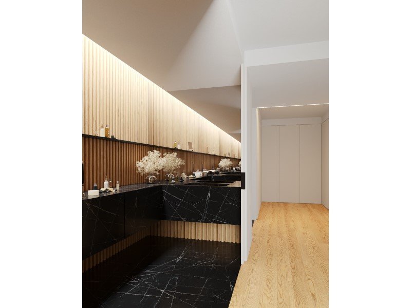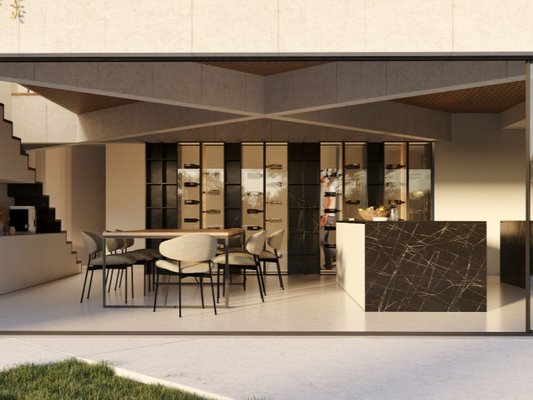 Das Wohnzimmer, geräumig mit 80m² nach Süden ausgerichtet, erhält viel natürliches Licht, während die moderne Küche im offenen Raum mit einer Fläche von 58m² ein Esszimmer umfasst und sich harmonisch mit der Außenseite integriert und ein hervorragendes Wohnerlebnis bietet.