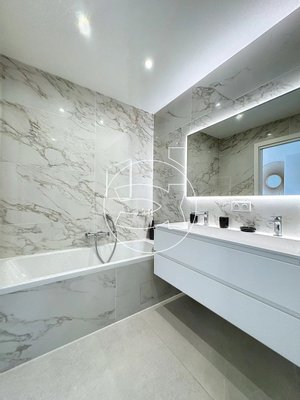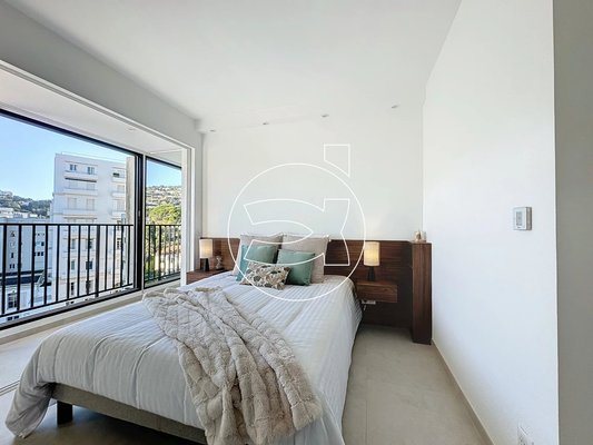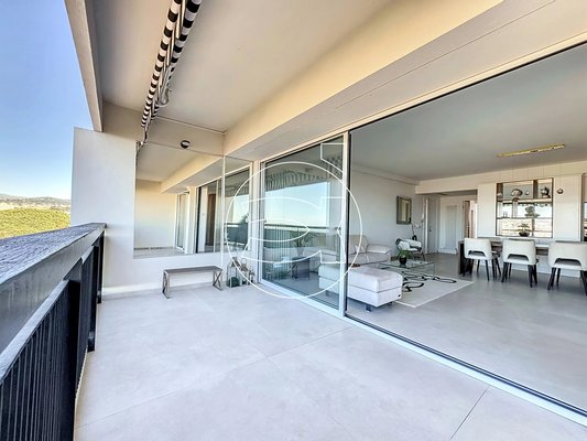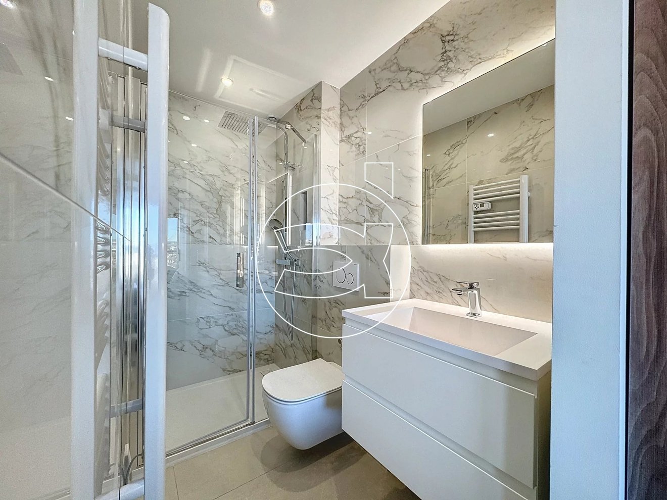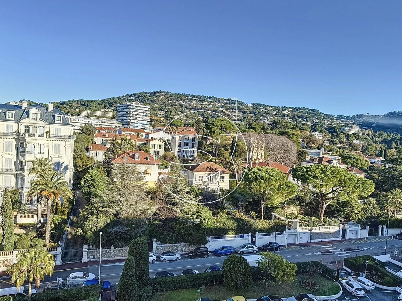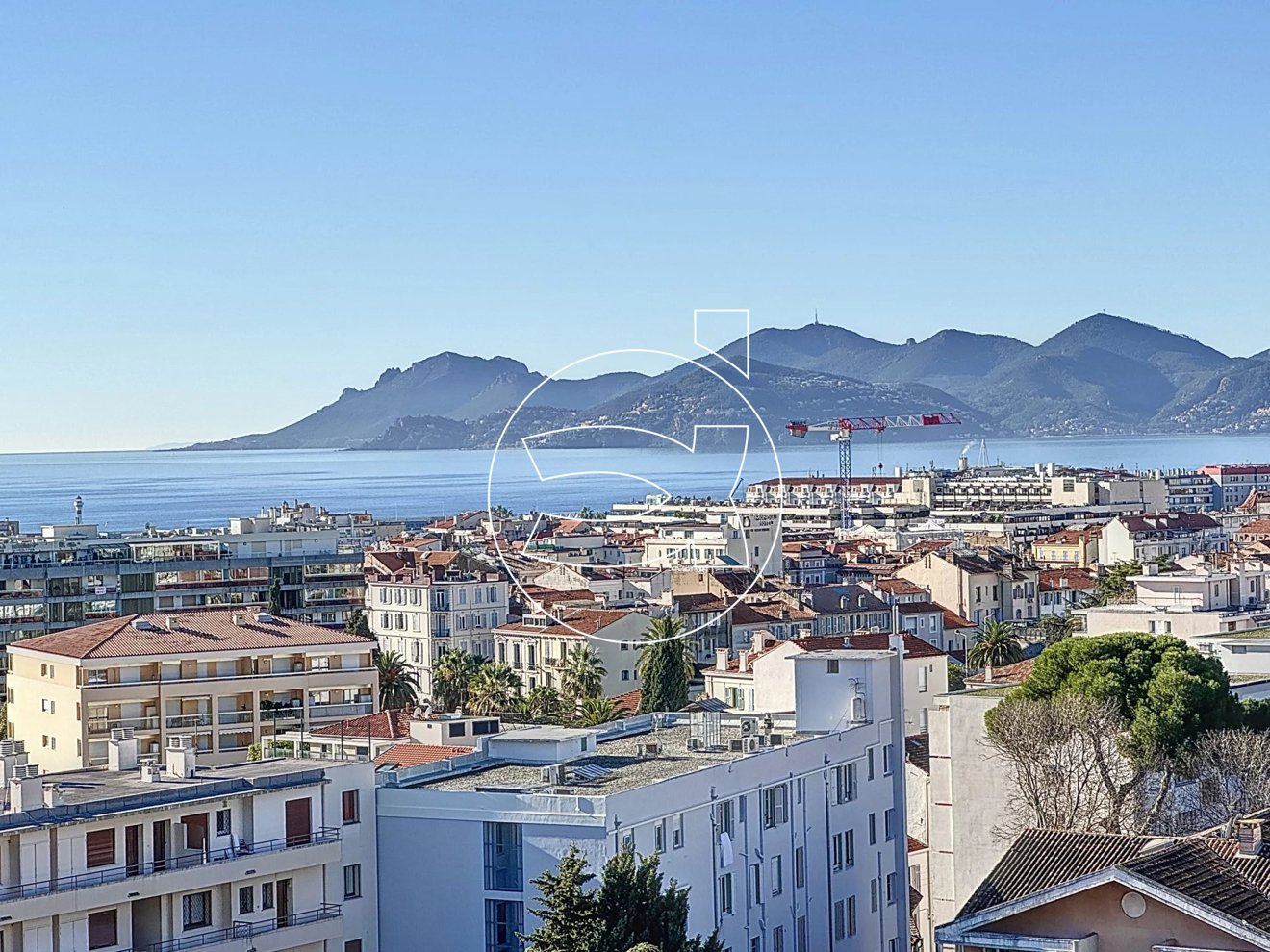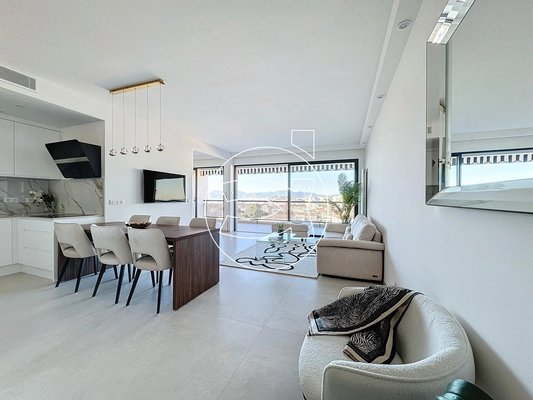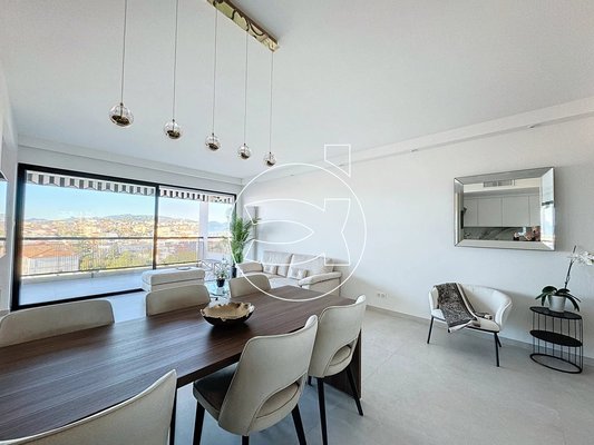 Dieses außergewöhnliche 94 m² große Appartement mit 3 Schlafzimmern liegt in einer ruhigen Lage mit herrlichem Panoramablick auf das Meer und befindet sich in der obersten Etage einer Luxusresidenz im Viertel Montfleury in Cannes.