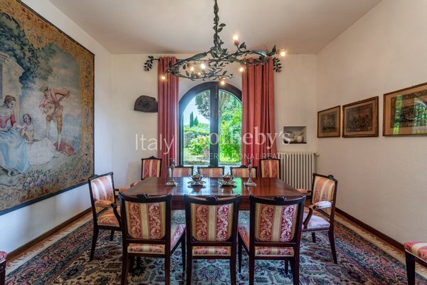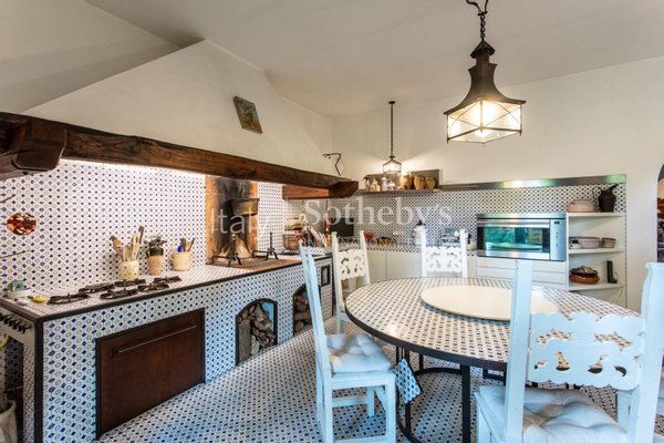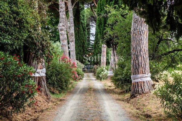 Um das Anwesen zu erreichen, gehen Sie eine lange Allee mit Pinien und Zypressen entlang, die direkt zum Haupteingang der Villa führt. Das Bauernhaus erstreckt sich über zwei Ebenen: Im Erdgeschoss befindet sich ein Doppelwohnzimmer mit einem imposanten Kamin, ein Esszimmer und eine große Küche, das vitale Zentrum des Hauses, sowie zwei Gästebäder.