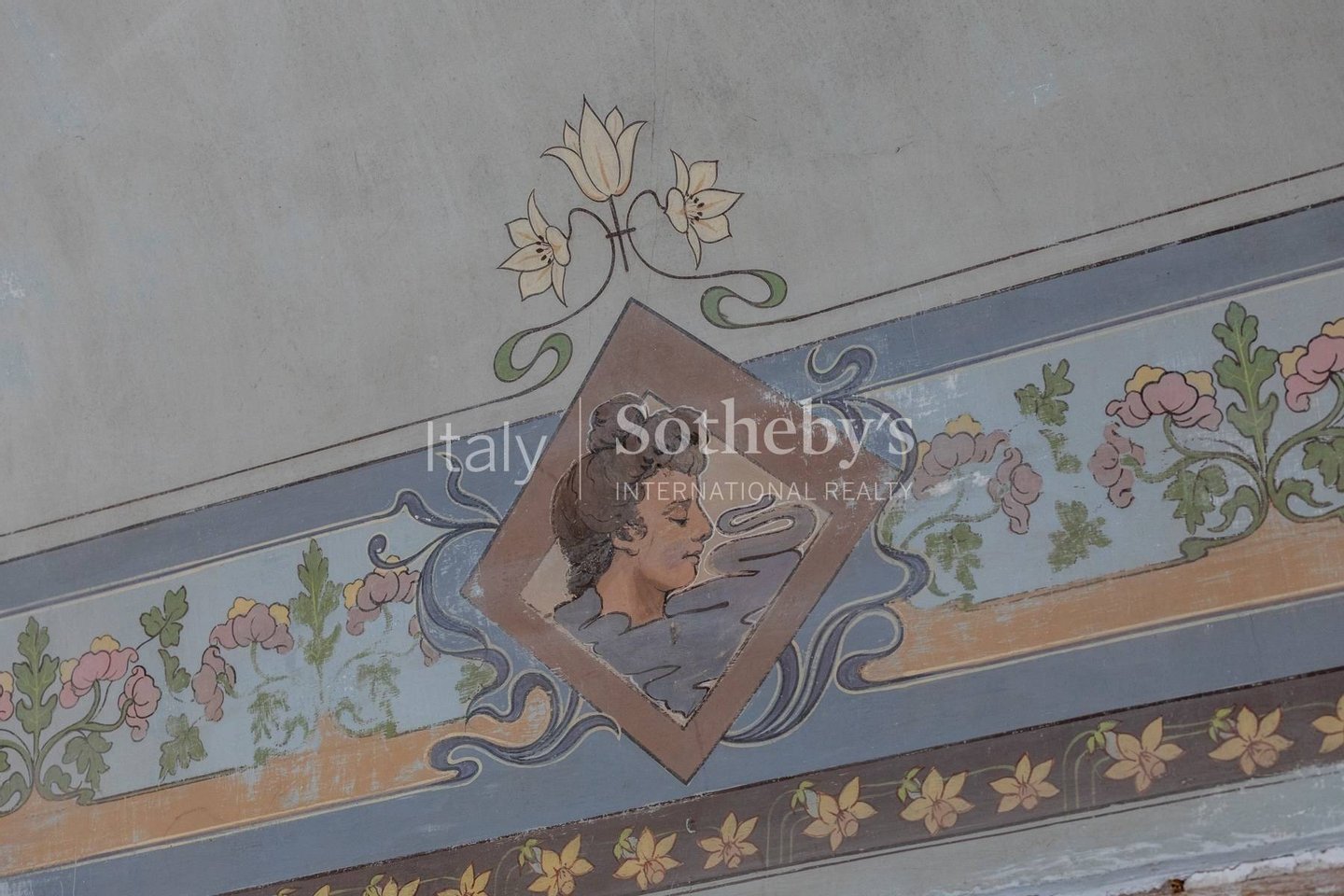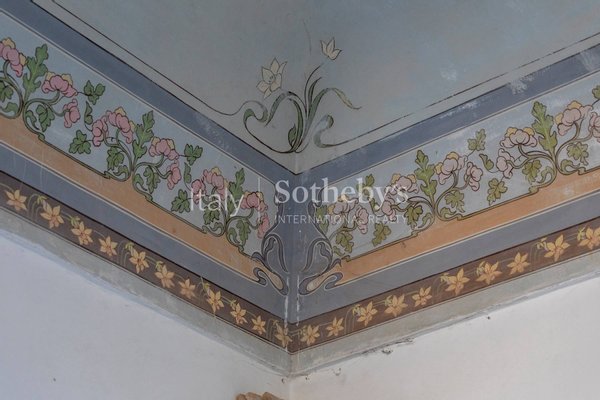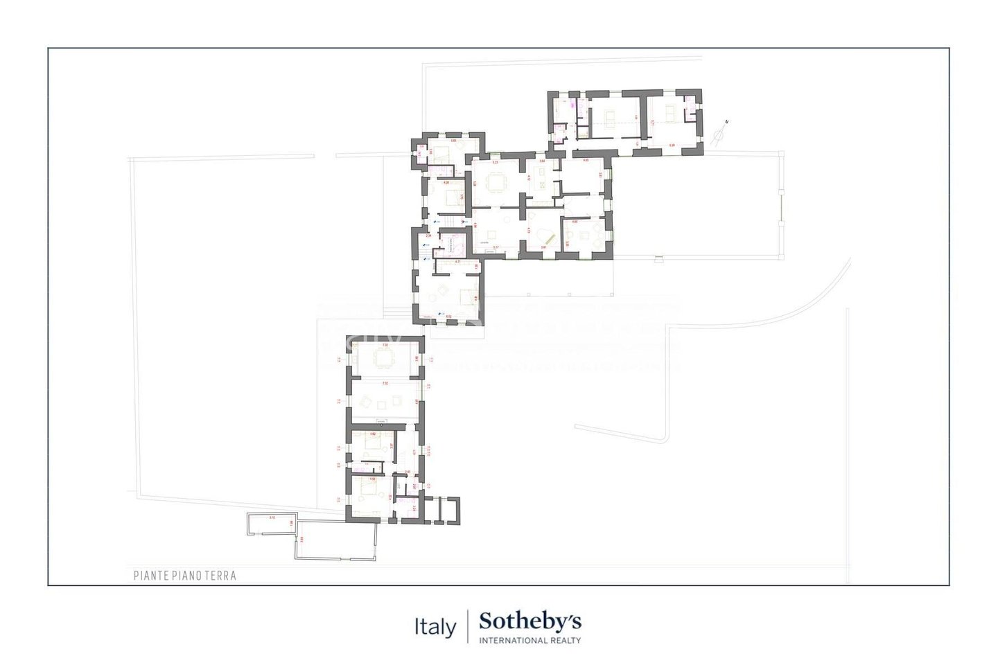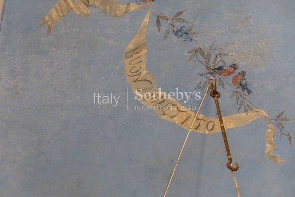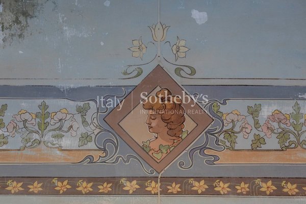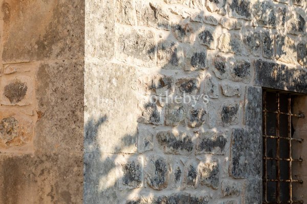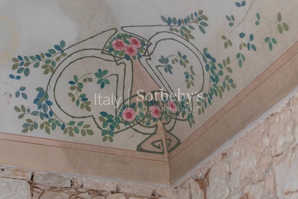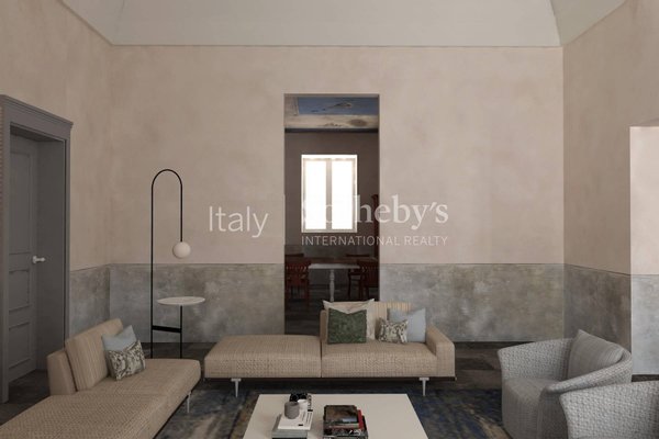 Das Hauptgebäude erstreckt sich über eine Fläche von etwa 440 Quadratmetern und verfügt über eine Panoramaterrasse, von der aus man einen beeindruckenden Blick auf die Landschaft und die Küste genießen kann. Die Innenräume, die durch fotografische Renderings dargestellt werden, umfassen großzügige Wohnbereiche, eine helle Küche mit Esszimmer und fünf Schlafzimmer, alle mit eigenem Bad und separatem Eingang. Die Haupträume sind noch mit malerischen Verzierungen an den Gewölbedecken versehen.