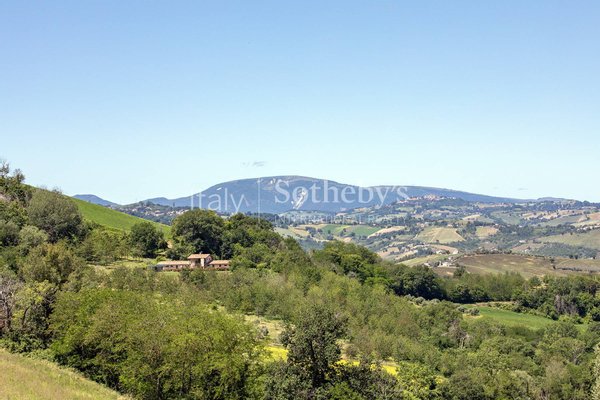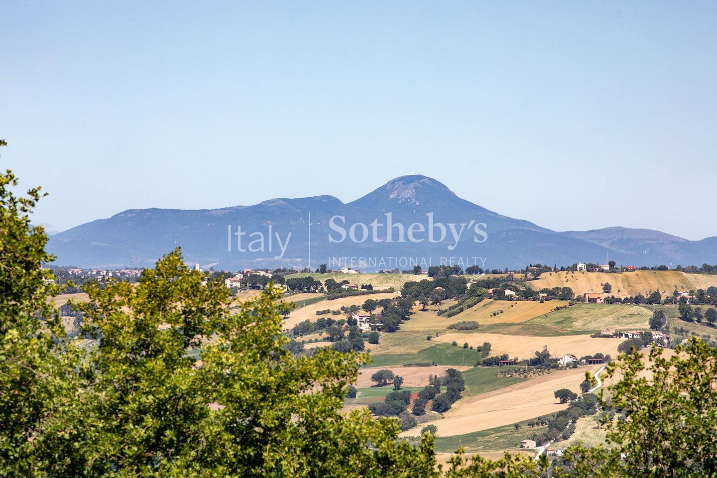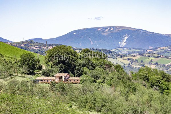 Diese einzigartige Immobilie in den grünen Hügeln der Marken, in der Nähe des mittelalterlichen Dorfes Falerone, erstreckt sich über 16 Hektar Land mit Kirsch- und Olivenbäumen. Die