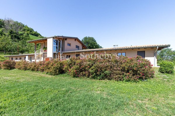 Diese einzigartige Immobilie in den grünen Hügeln der Marken, in der Nähe des mittelalterlichen Dorfes Falerone, erstreckt sich über 16 Hektar Land mit Kirsch- und Olivenbäumen. Die neu erbaute Struktur, etwa 380 qm, besteht vollständig aus Holz mit einer erdbebensicheren Konstruktion, isoliert mit natürlichen Materialien und bedeckt mit lokalen Steinen, was eine Philosophie des Umweltschutzes und der Landschaftsintegration widerspiegelt. Sie umfasst fünf unabhängige Apartments, jedes mit Wohnzimmer-Küche, Badezimmer und Doppelzimmer, sowie zwei Schlafzimmer im zweiten Stock mit privaten Badezimmern und einer gemeinsamen Terrasse. Das Erdgeschoss verfügt über eine 100 qm große Veranda, einen 60 qm großen Gemeinschaftsbereich mit Lounge, zwei Badezimmern, einem zentralen Holzofen und einer professionellen Küche, die sich ideal für Veranstaltungen eignet. Das Anwesen bietet einen beheizten Salzwasserpool mit Gegenstromanlage, einen 100 qm großen Wellnessbereich mit Sauna, Türkischem Bad, Chromotherapie-Duschen und ein Solarium im Obergeschoss. Weitere Annehmlichkeiten umfassen einen Heizraum und einen Lagerraum von etwa 30 qm. Umweltfreundlich nutzt die Immobilie erneuerbare Energien für die Heizung, mit Systemen zur Regenwassersammlung, einer Klärgrube und zwei Brunnen. Perfekt für Tourismus, Agritourismus, Agri-Camping oder private Rückzugsorte bietet sie Ruhe und Privatsphäre in der Nähe der wichtigsten Dienstleistungen. Sie liegt 30 Minuten von Fermo und dem Meer entfernt und etwa eine Stunde vom Flughafen Ancona-Falconara.