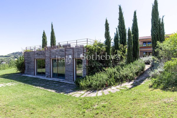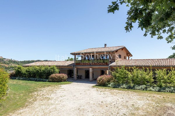 Diese einzigartige Immobilie in den grünen Hügeln der Marken, in der Nähe des mittelalterlichen Dorfes Falerone, erstreckt sich über 16 Hektar Land mit Kirsch- und Olivenbäumen. Die neu erbaute Struktur, etwa 380 qm, besteht vollständig aus Holz mit