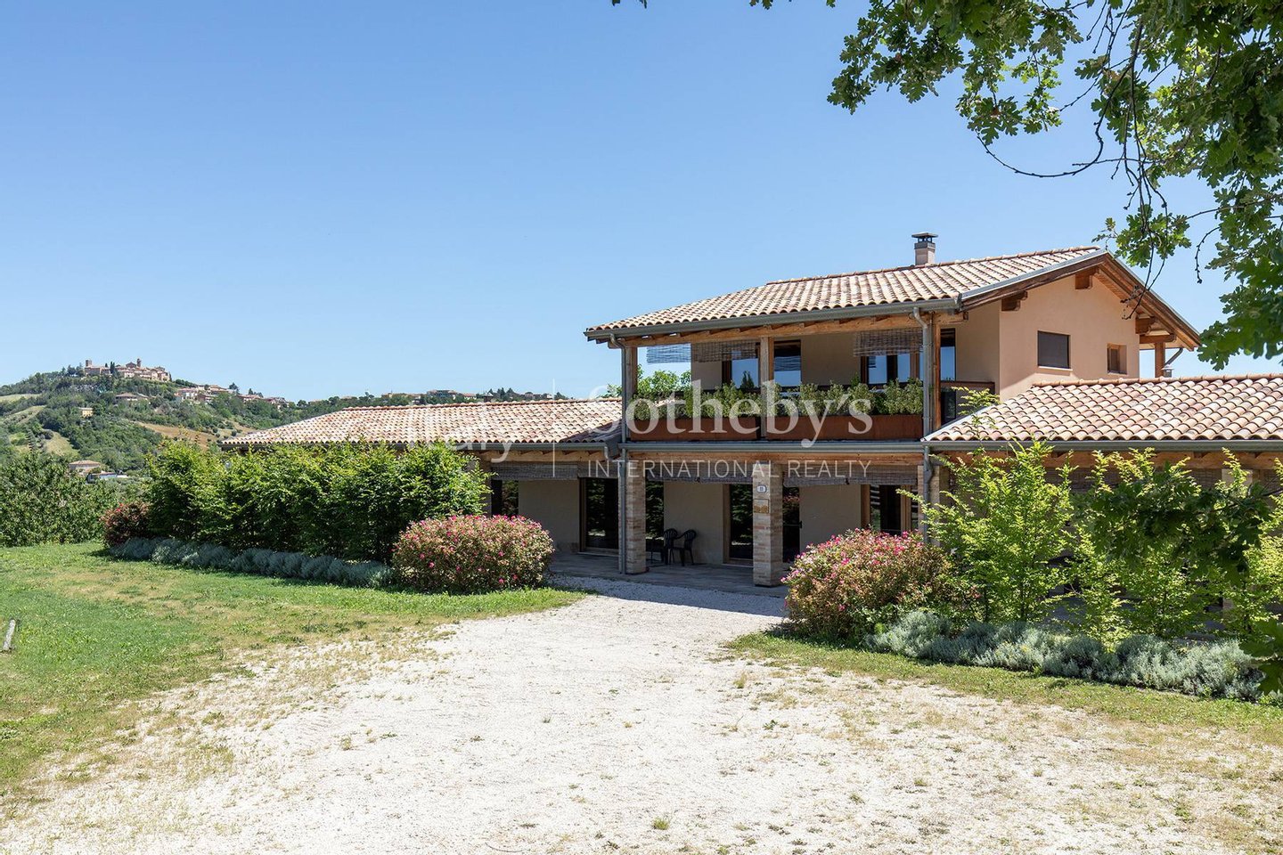 Diese einzigartige Immobilie in den grünen Hügeln der Marken, in der Nähe des mittelalterlichen Dorfes Falerone, erstreckt sich über 16 Hektar Land mit Kirsch- und Olivenbäumen. Die neu erbaute Struktur, etwa 380 qm, besteht vollständig aus Holz mit