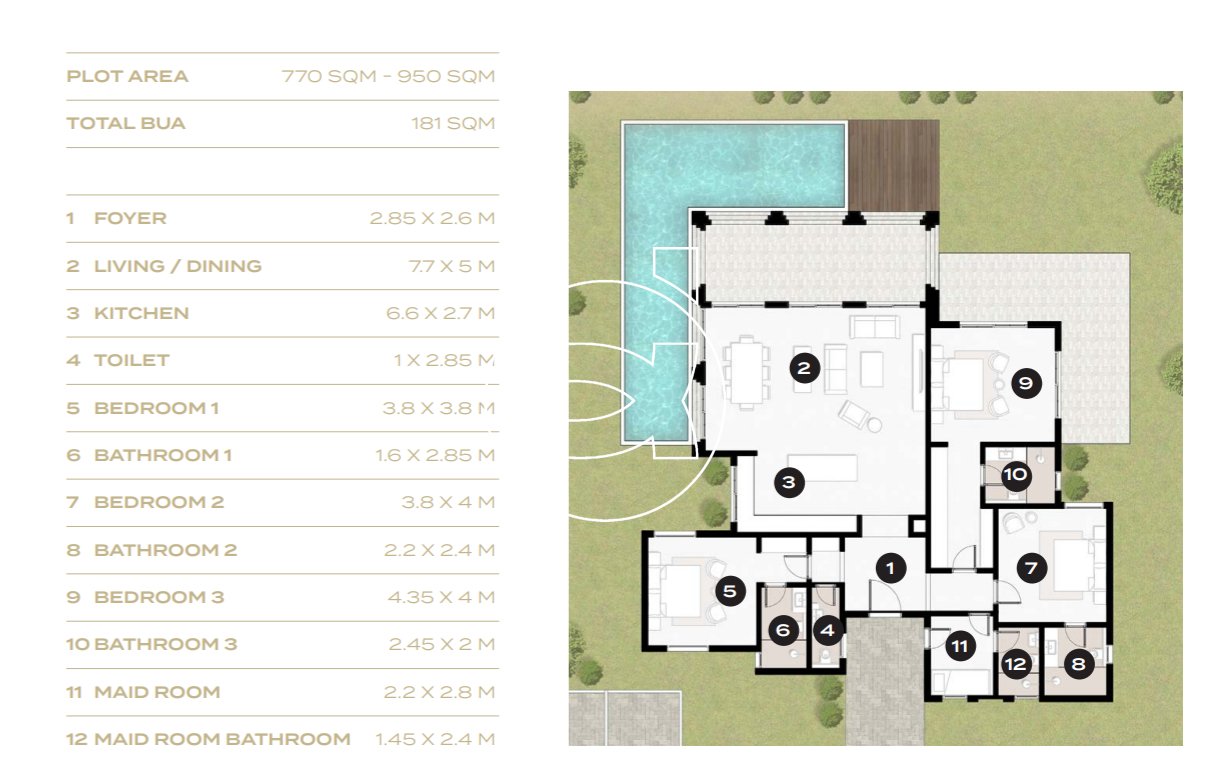 Der Wohnraum jeder Villa erstreckt sich durch raumhohe Glastüren, welche auf die private Poolterrasse führen, die mit maßgefertigter Holztischlerei sowie einem luxuriösem Schwimmbecken im Resort-Stil ausgestattet ist.
