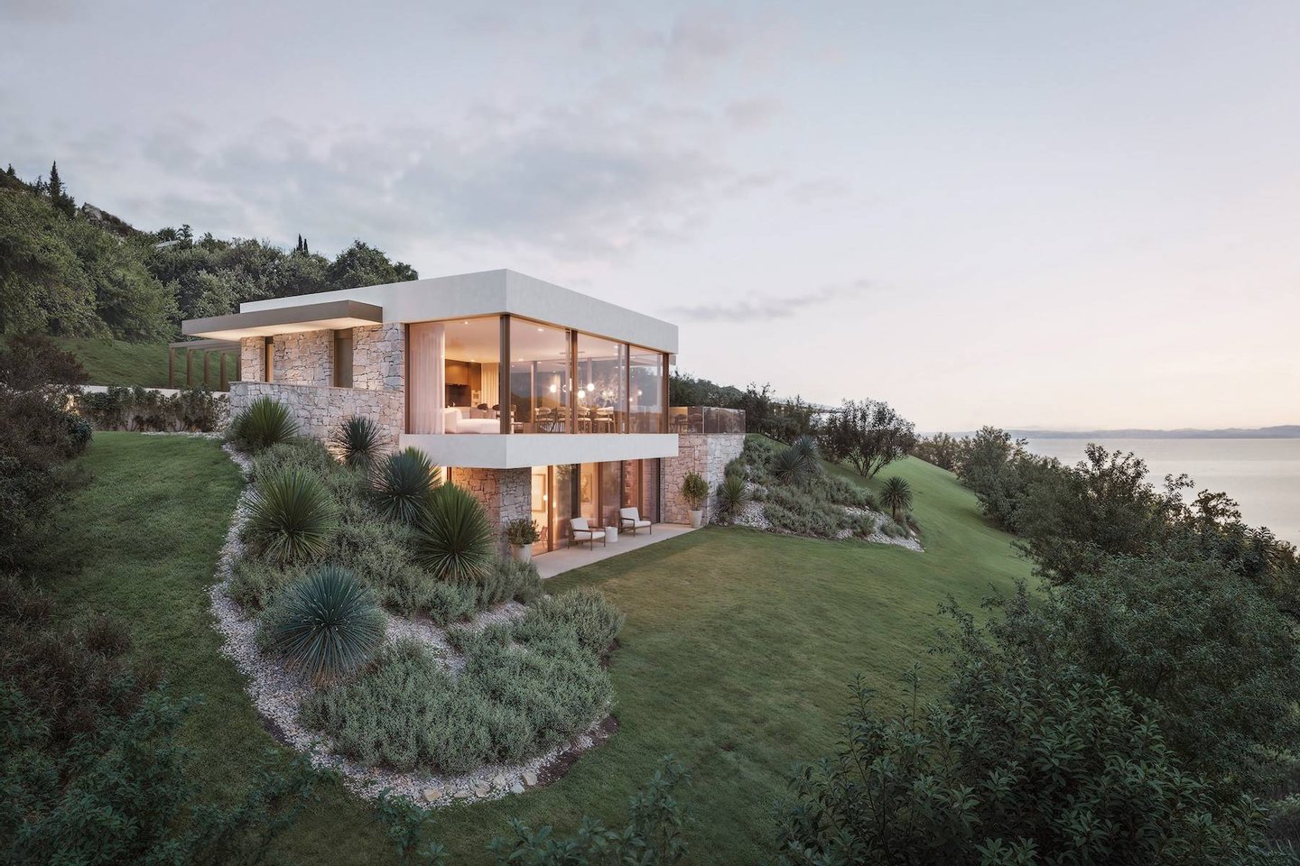 Im oberen Stockwerk, das vom Innenhof mit zwei Stellplätzen zugänglich ist, befindet sich der Wohnbereich. Diese Zone wird durch große Fensterflächen geprägt sein, die einen herrlichen Blick auf den See ermöglichen und direkten Zugang zur überdachten Terrasse und zum Infinity-Pool bieten. Dieser Bereich wurde so konzipiert, dass er ein einzigartiges Wohngefühl vermittelt, indem er Innen- und Außenbereiche integriert und das natürliche Licht maximiert.