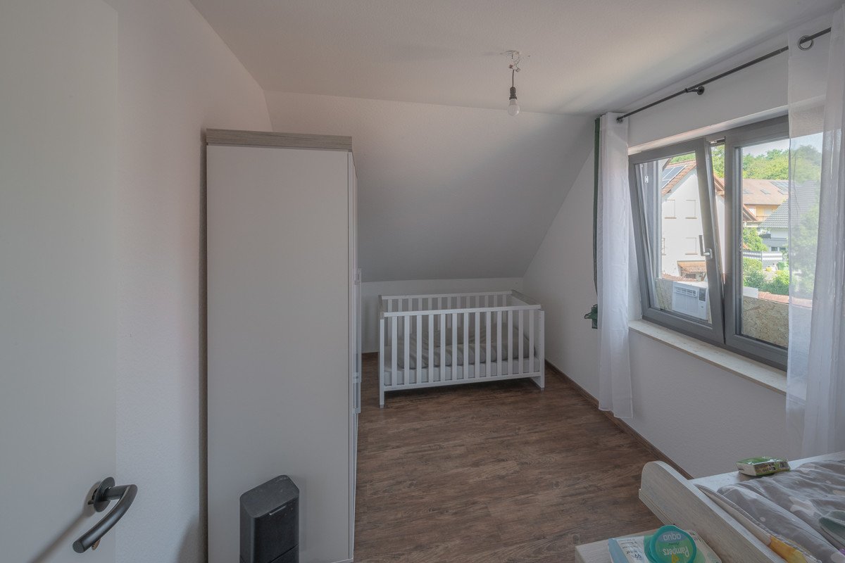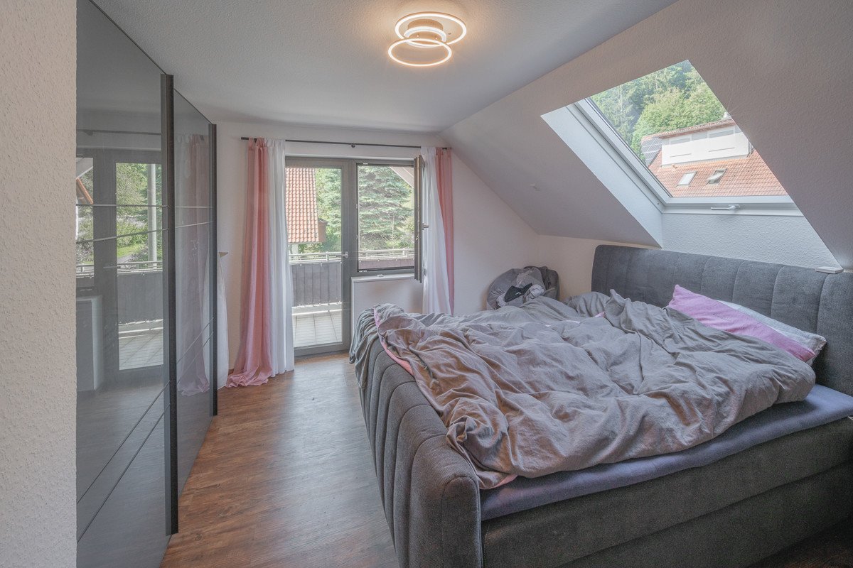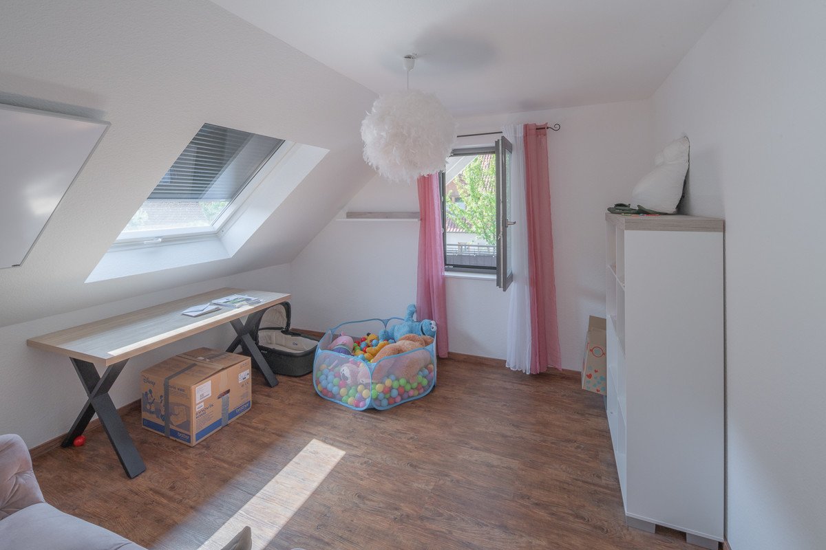 Im Dachgeschoss befinden sich drei Schlafzimmer, ein Balkon und ein Tageslichtbad mit Dusche und Badewanne.