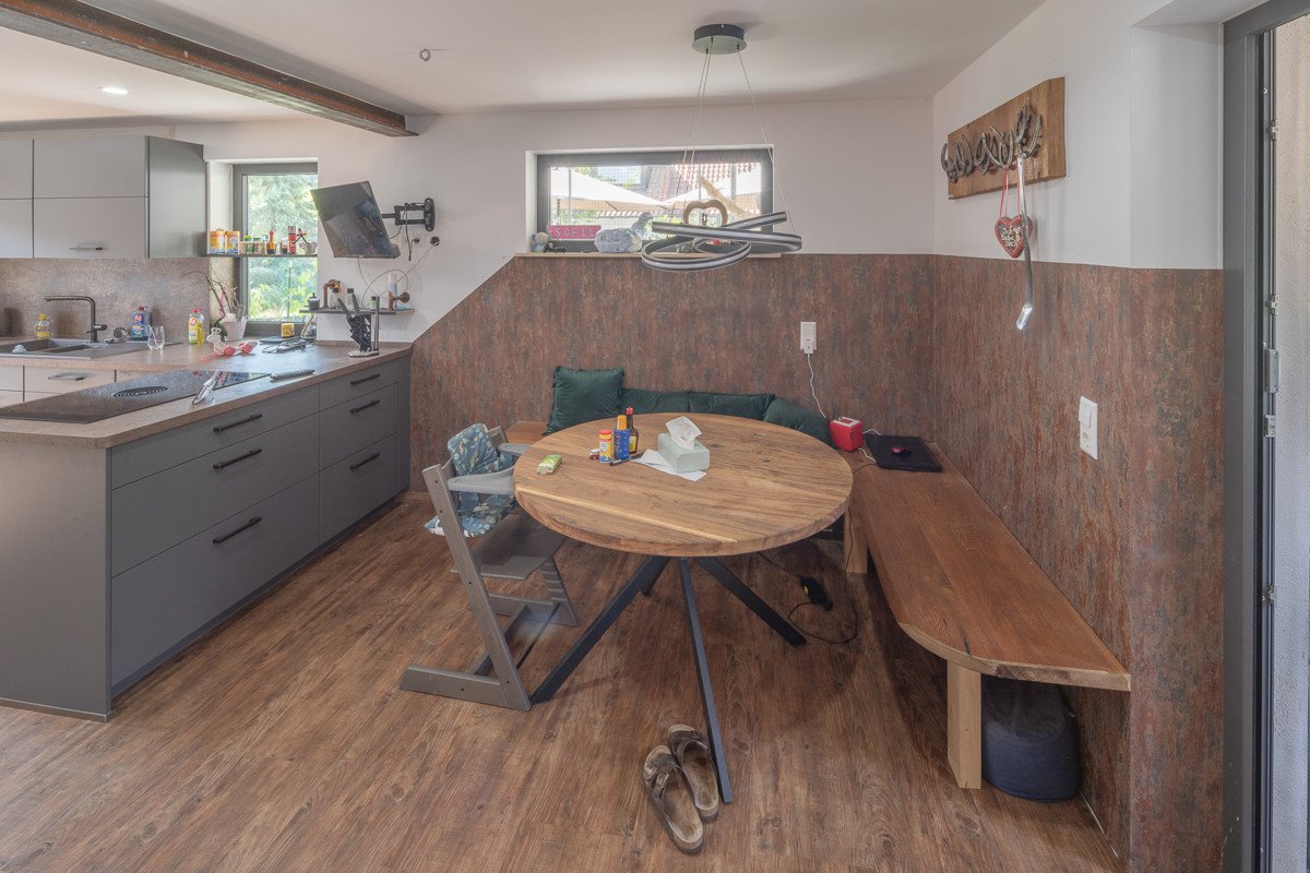 Im Erdgeschoss führt der helle Eingangsbereich in den offenen Wohn- und Essbereich mit Küchenraum. Ein Gäste-WC ist ebenfalls vorhanden.