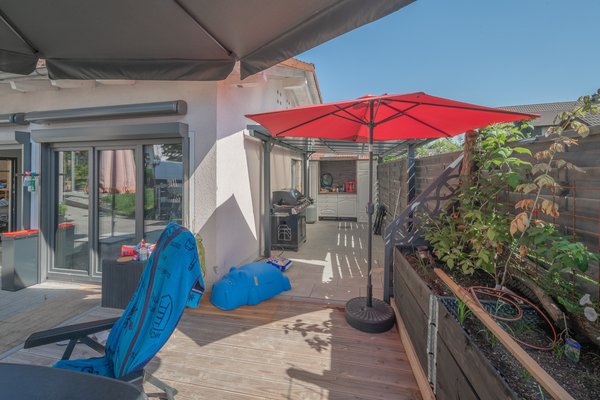 Morgens kann der Tag auf der großen Terrasse mit viel Sonne beim gemeinsamen Familienfrühstück im Freien beginnen.