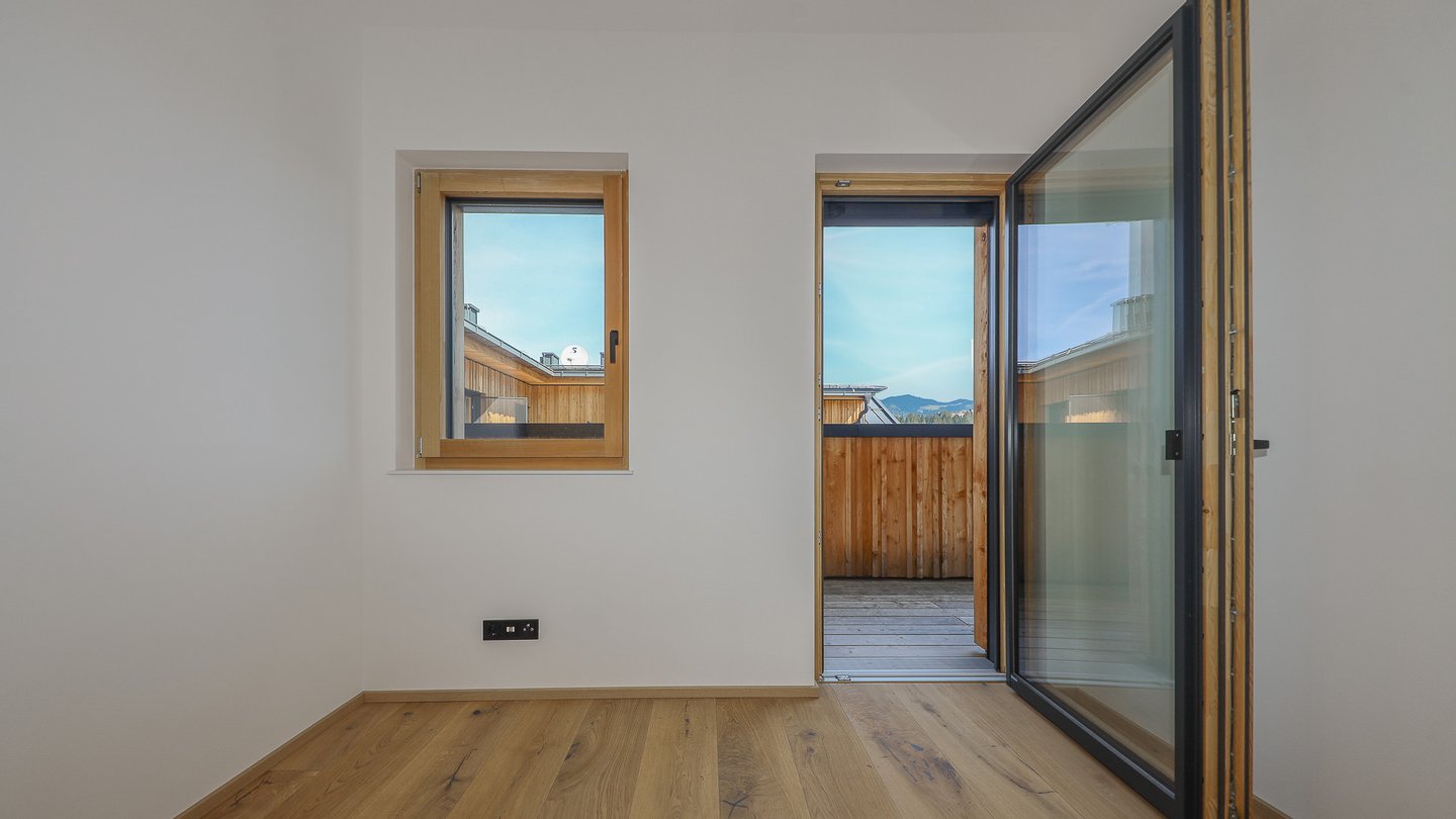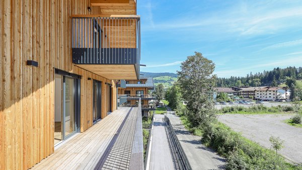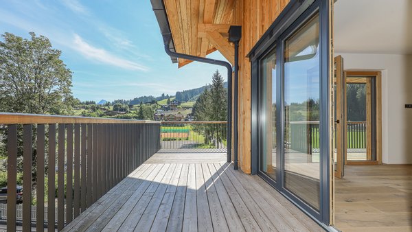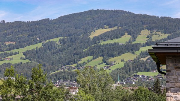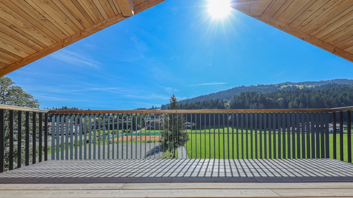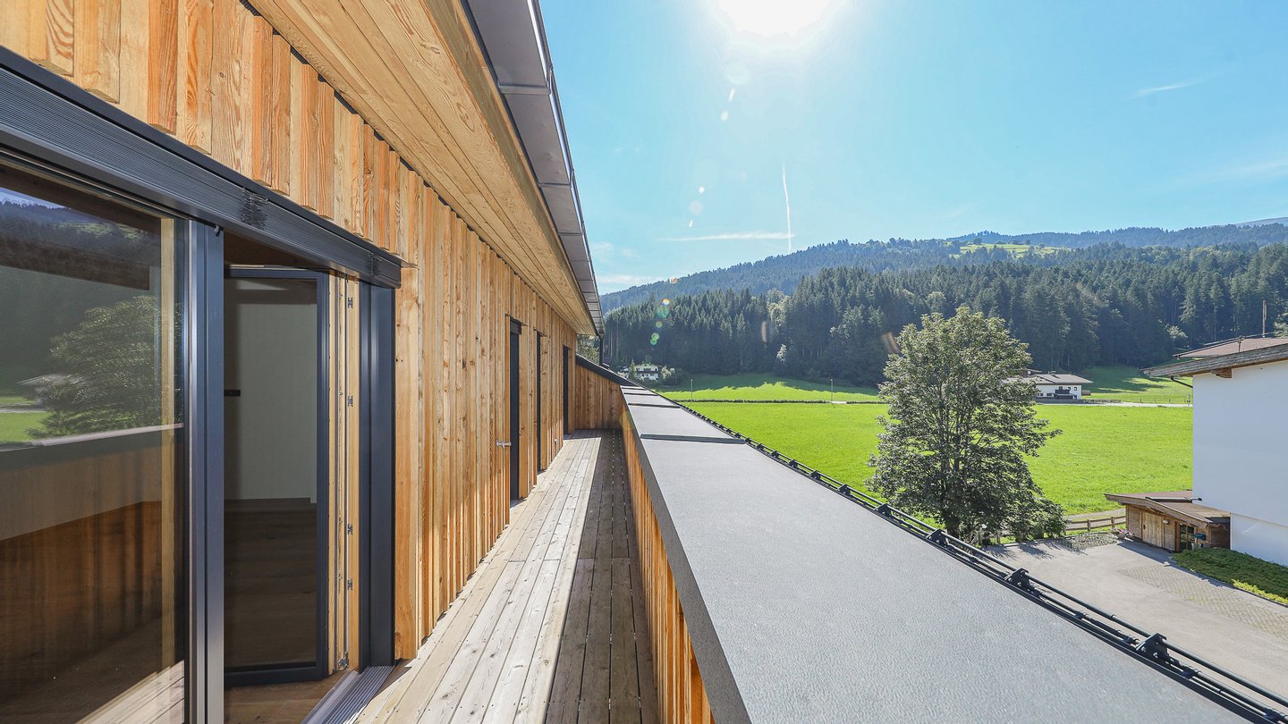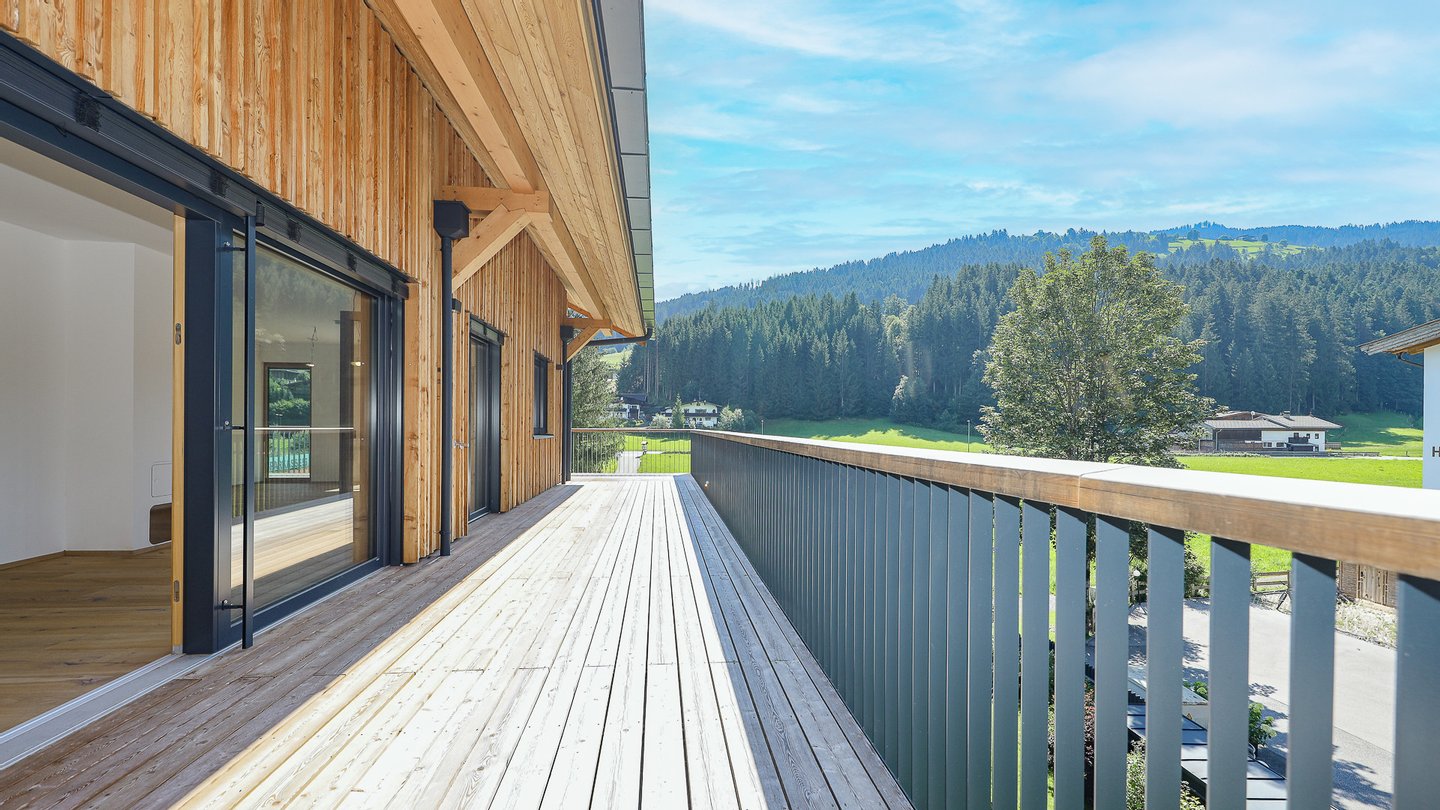 Vom Wohnbereich, dem Essbereich und dem Schlafzimmer gelangt man auf die 85 m² große, umlaufende Richtung Osten, Süden & Norden ausgerichtete Balkon-Terrasse, von der man einen herrlichen Blick auf den Rettenstein, das Kitzbüheler Horn und den Sonnberg hat.