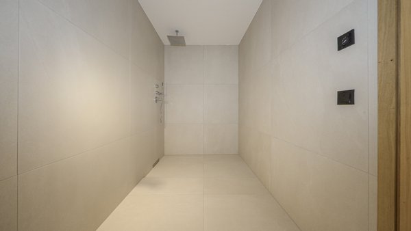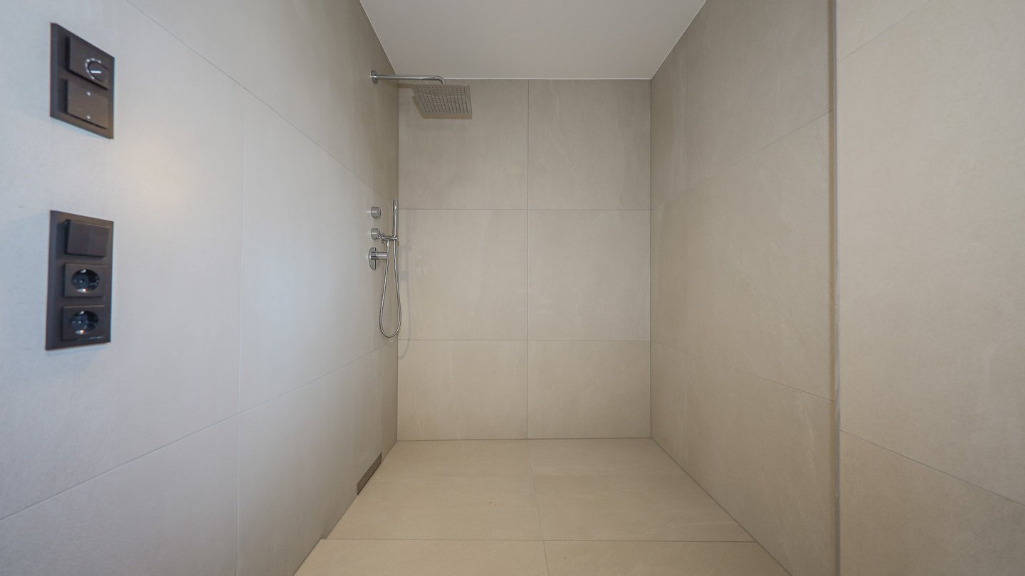 Alle Wohn- und Schlafräume sind mit Eichendielen verlegt, die Badezimmer mit besonders großen, zeitlos eleganten Fliesen und Armaturen ausgestattet.