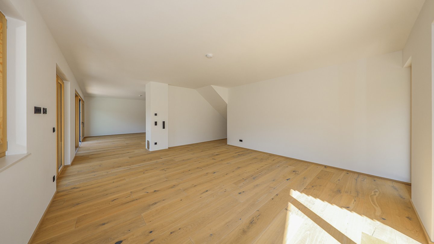 Über eine Treppe im Vorraum erreicht man das Dachgeschoss der Luxuswohnung.