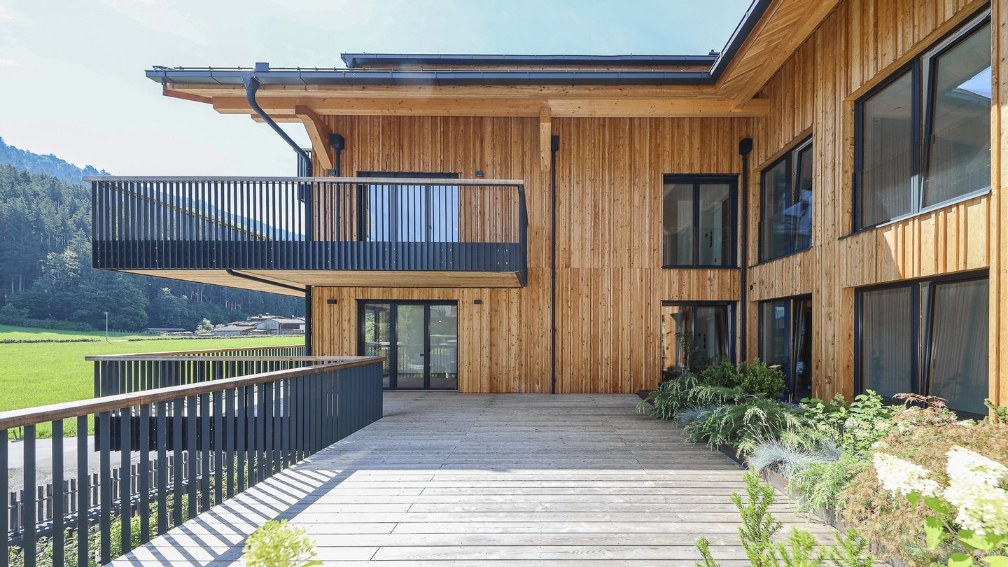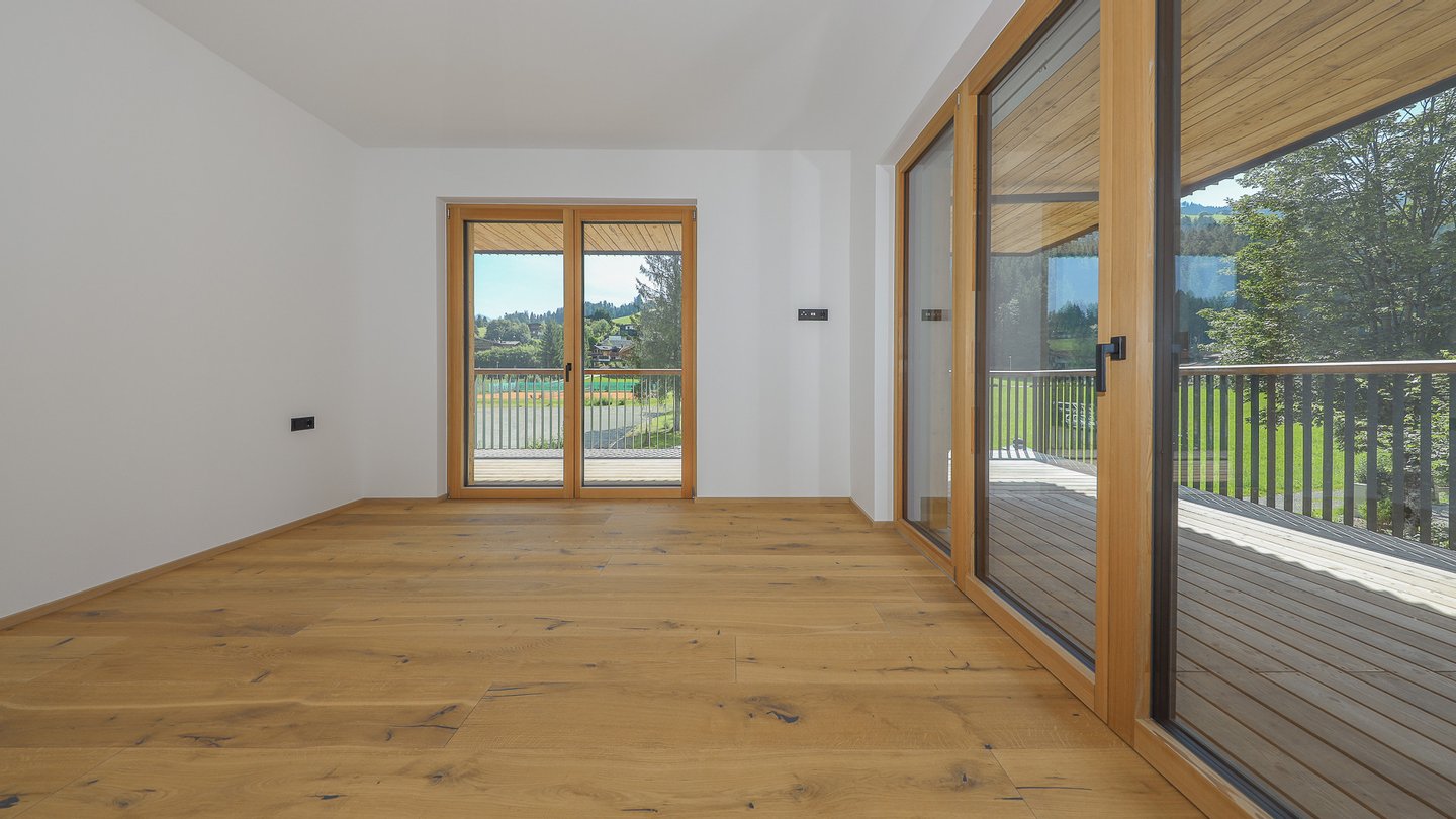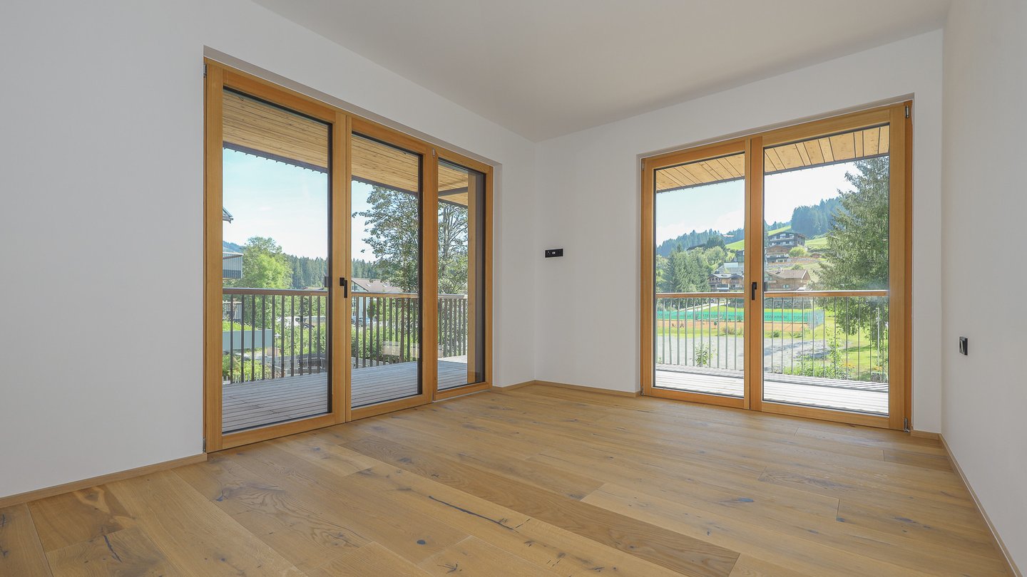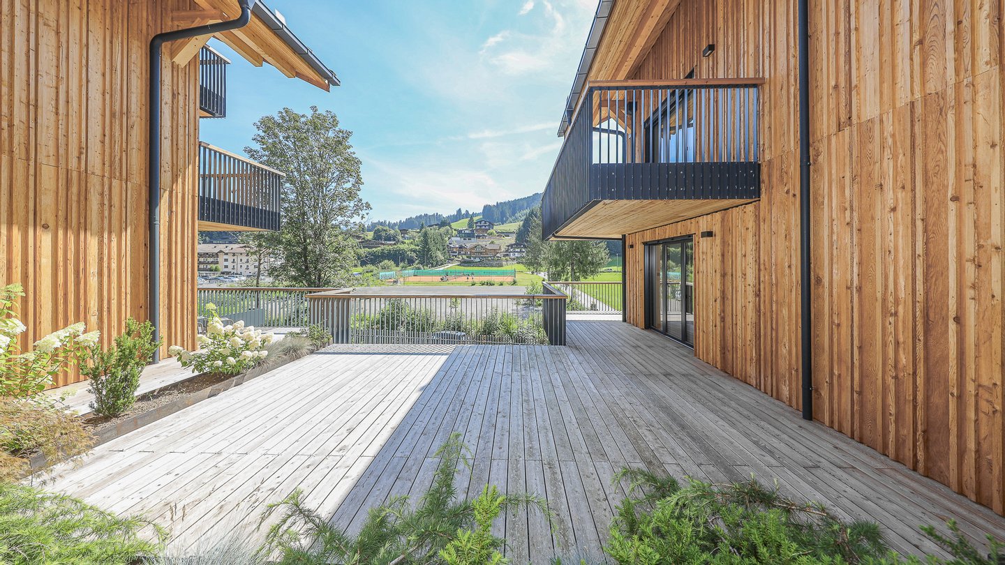 Vom Wohnbereich gelangt man auf die 118 m² große, umlaufende Richtung Osten, Süden & Norden ausgerichtete Balkon-Terrasse, von der man einen herrlichen Blick auf den Rettenstein, das Kitzbüheler Horn und den Sonnberg hat.