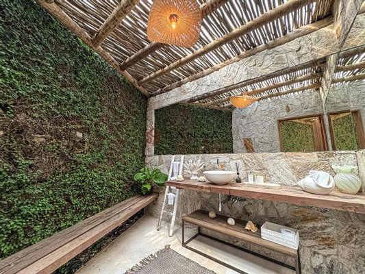 Wohnzimmer mit Blick auf das Meer mit einem Loungebereich im Garten voller Glamour und Raffinesse