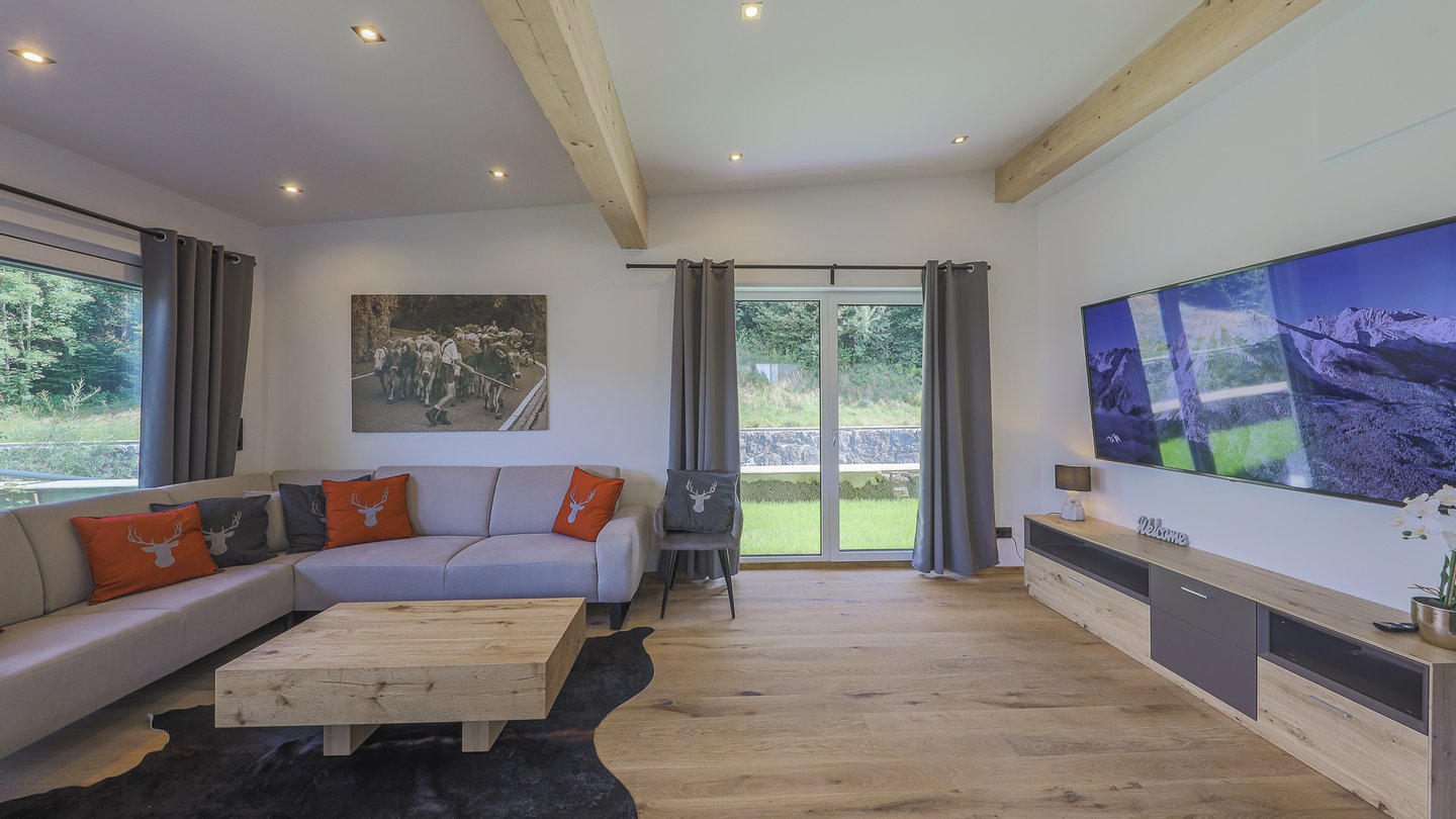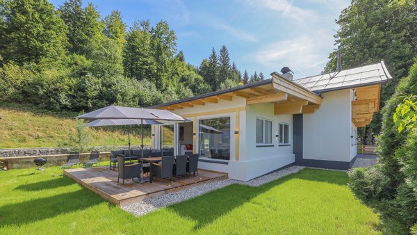 Vom Wohnbereich gelangt man auf eine umlaufende Terrasse und in den kleinen Garten.
