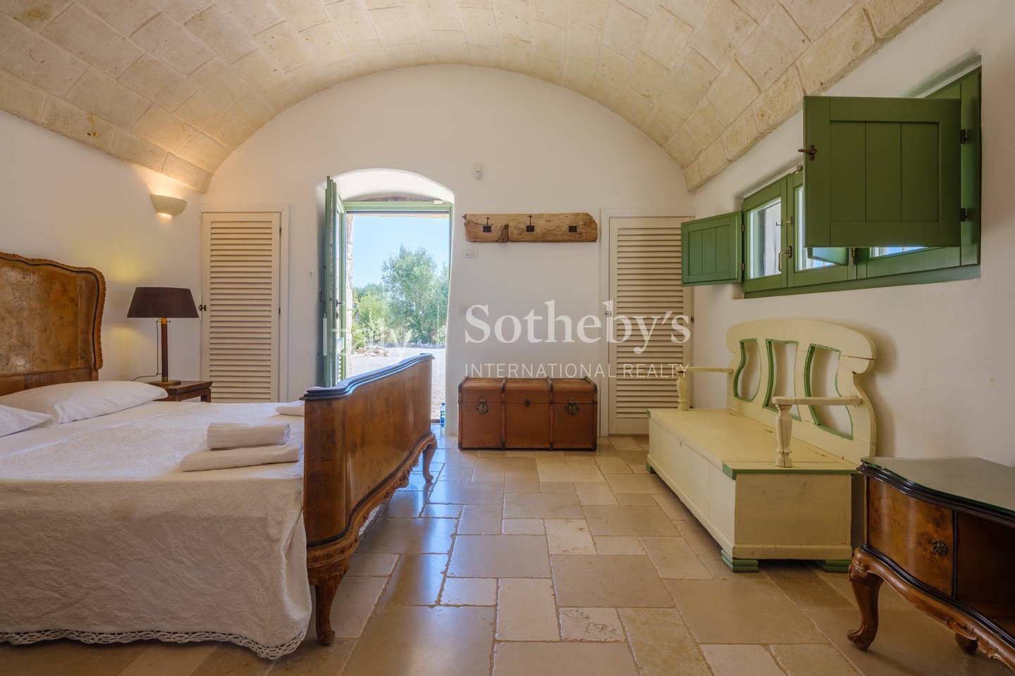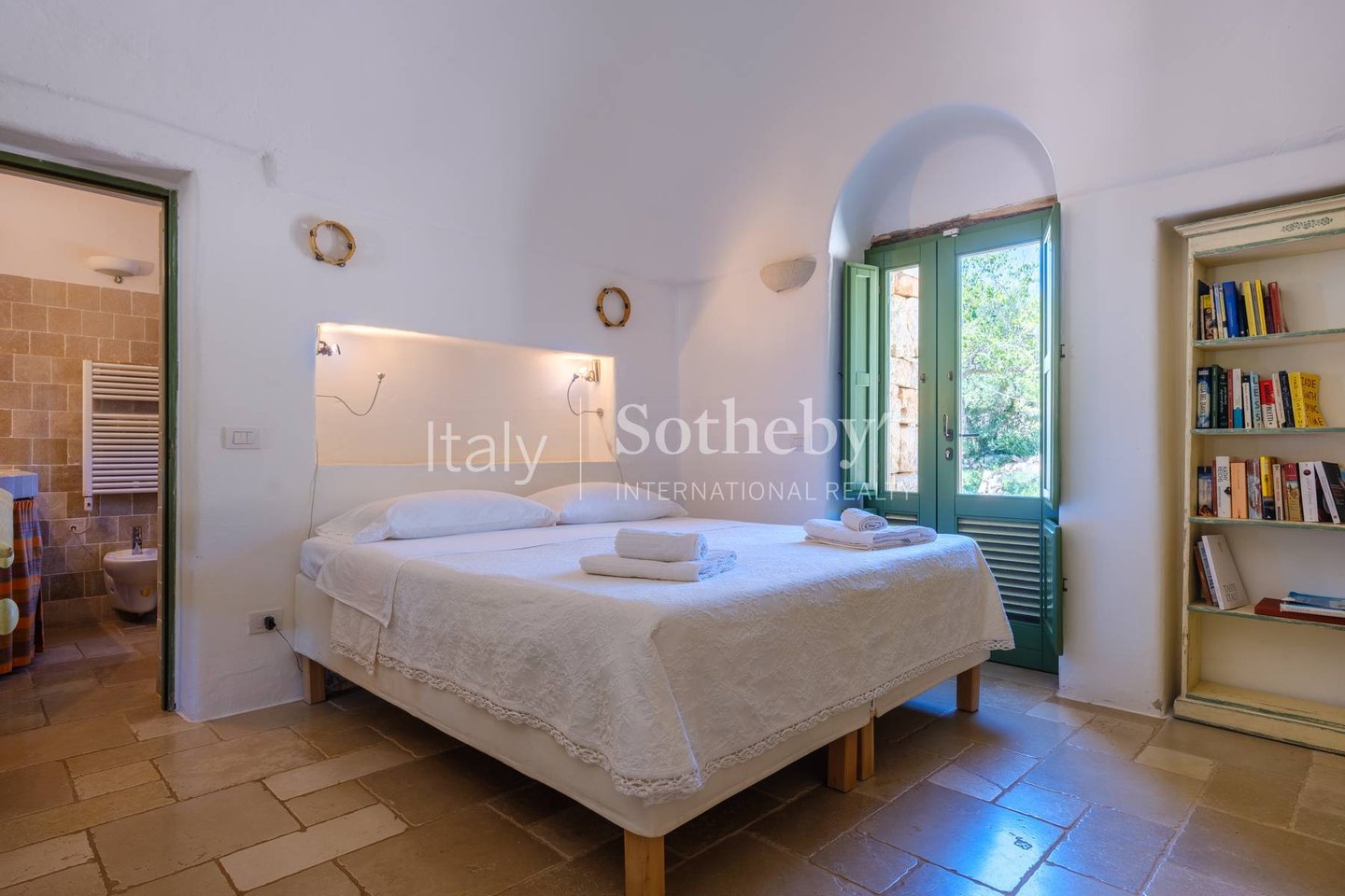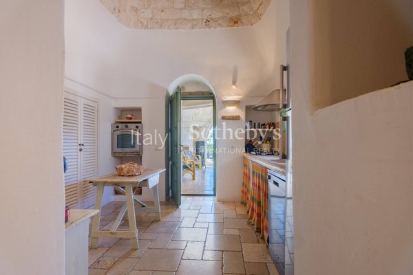 Das Innere der Immobilie ist in drei Hauptbereiche und eine Veranda unterteilt. Der erste Bereich besteht aus einem großen Wohnbereich mit einem charakteristischen offenen Kamin, einem Essbereich, einer Steinküche, drei Badezimmern und zwei Doppel-Suiten. Die Veranda, einzigartig in ihrer Art, ist ein großer Trullo mit offenen Bögen, der die Form der Vergangenheit mit modernen großen Glasflächen vereint.